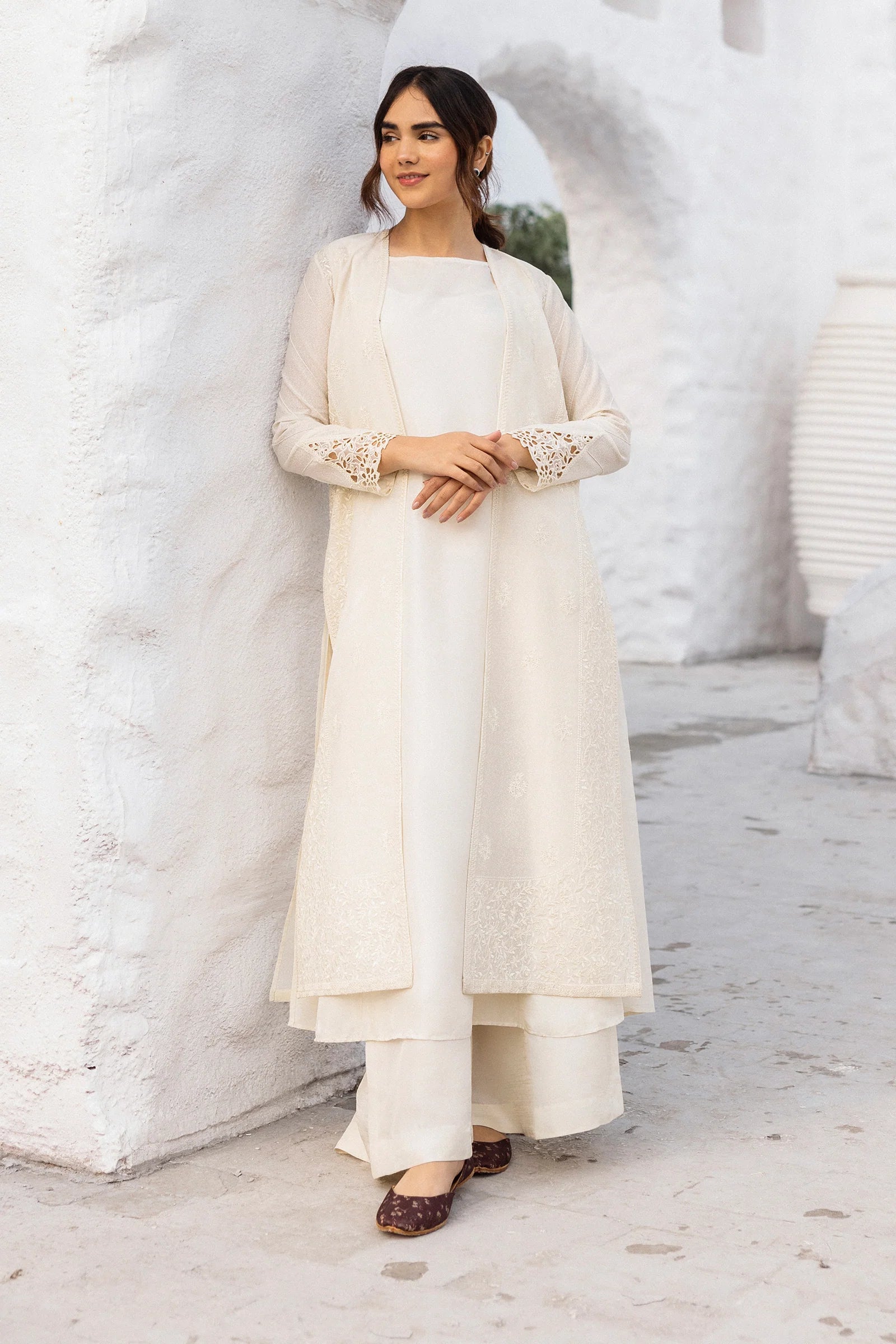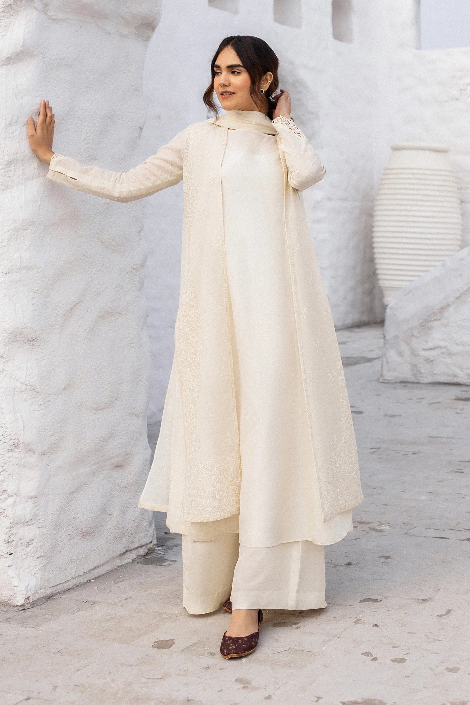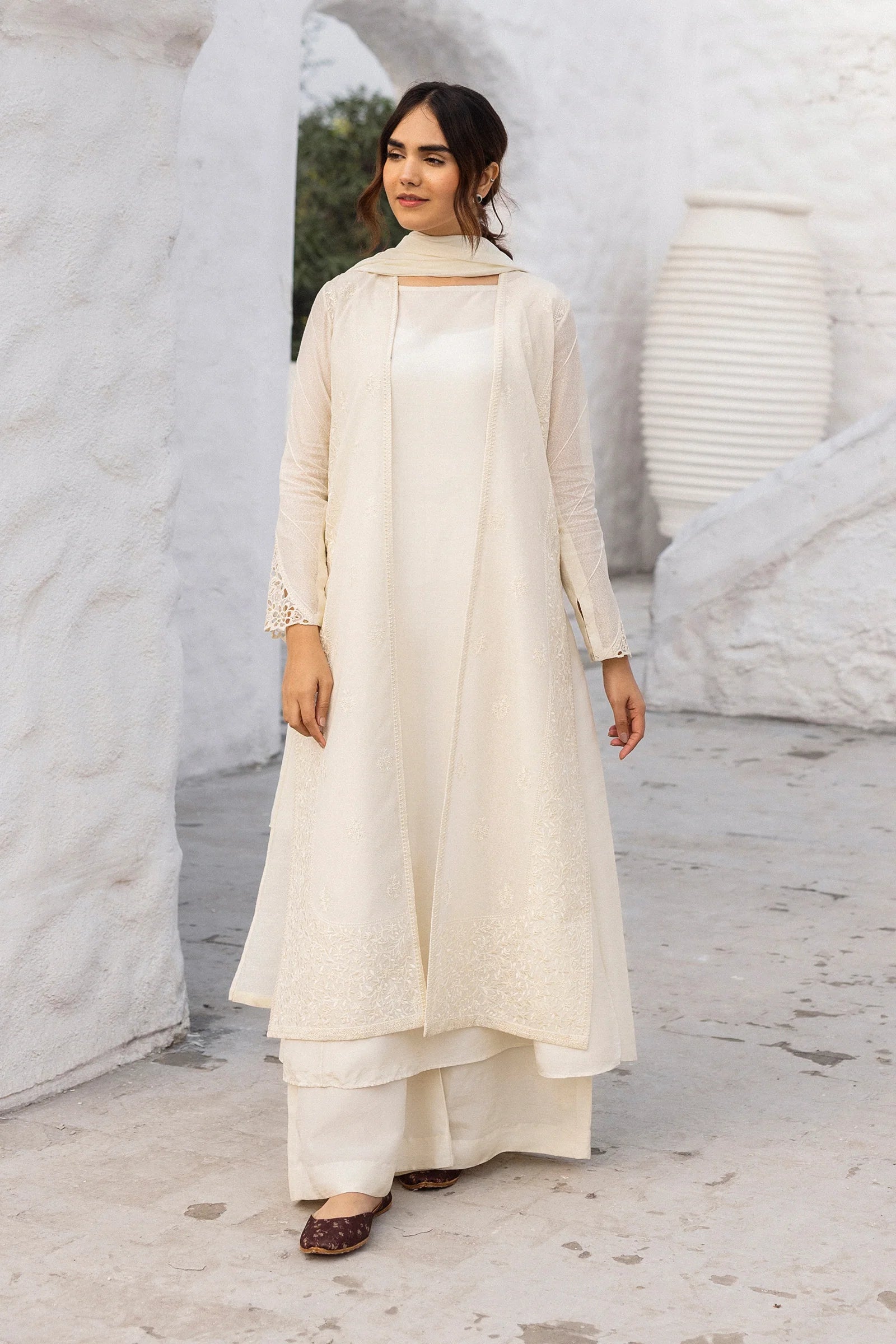 This elegant outfit is crafted from premium cotton karandi in a timeless pearl white color, enhanced with luxurious gold foil printing. The sheer net embroidered cuffs add a delicate, refined touch to the design. It is paired with a chic choridaar featuring intricate gota trim for a stylish finish. Completing the look is a chiffon dupatta, beautifully bordered with detailed embroidery all around, making this ensemble a perfect blend of grace and sophistication.