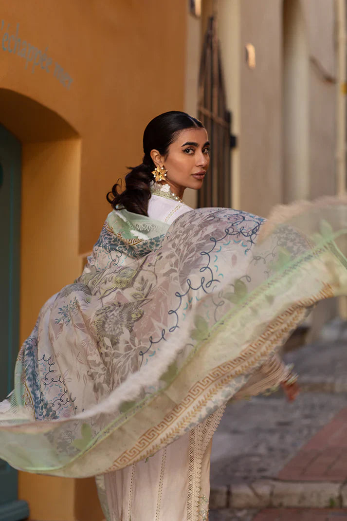 This design features a white base with beachy tones of beige, blue, and green. Embroidered palm trees, seashells, and leaves, along with cutwork organza borders and a printed silk dupatta, create a light, calming coastal aesthetic.