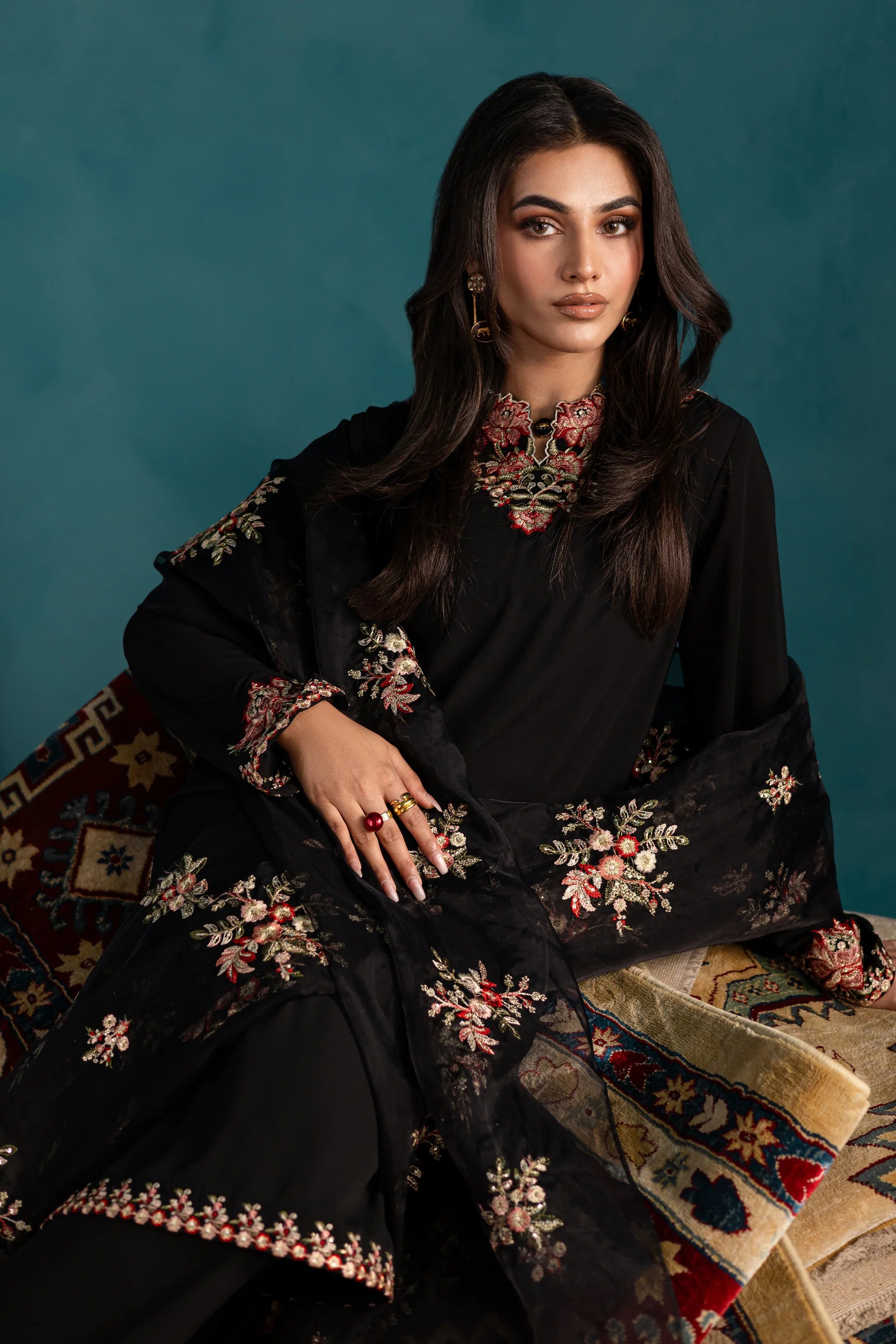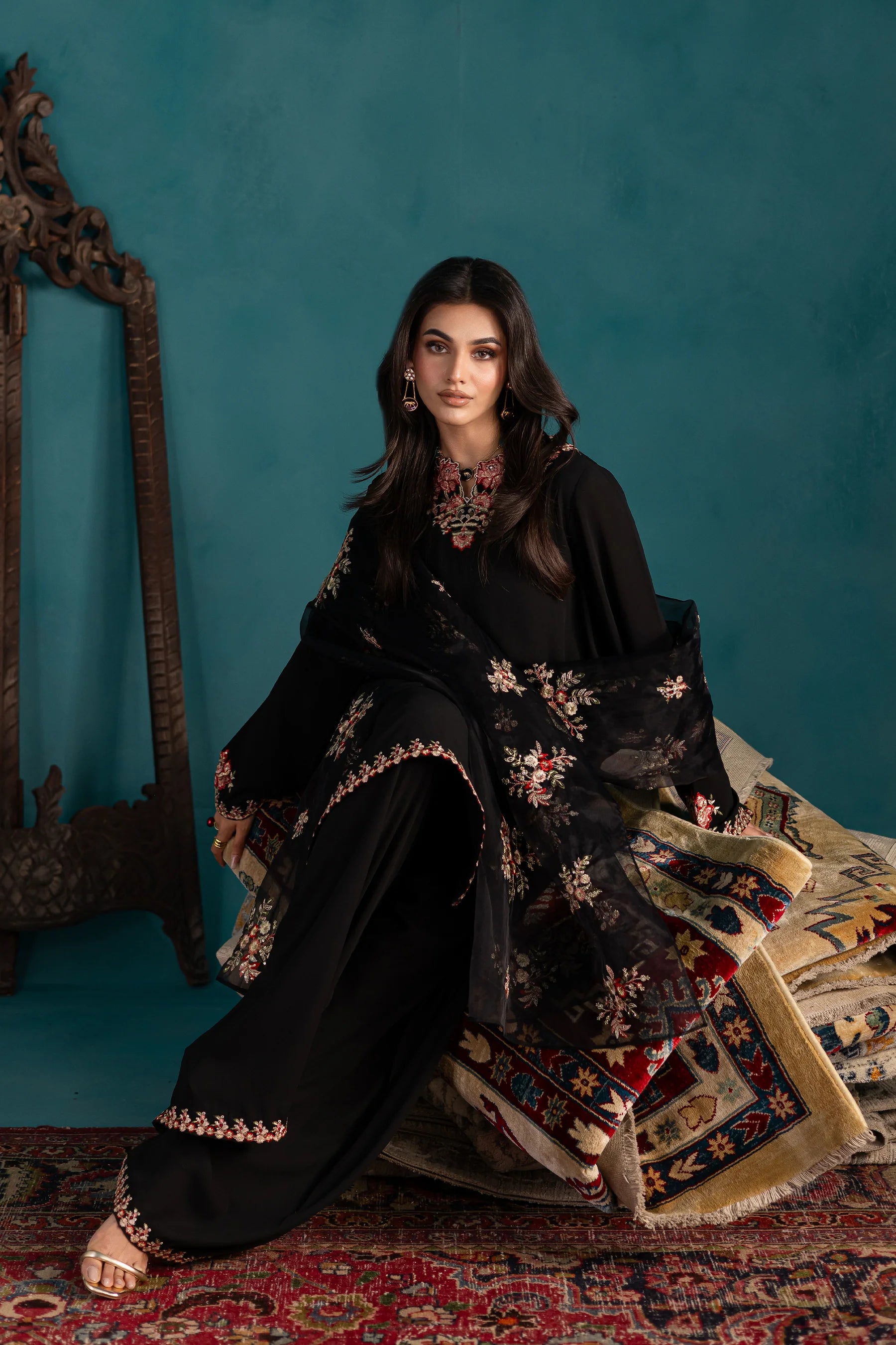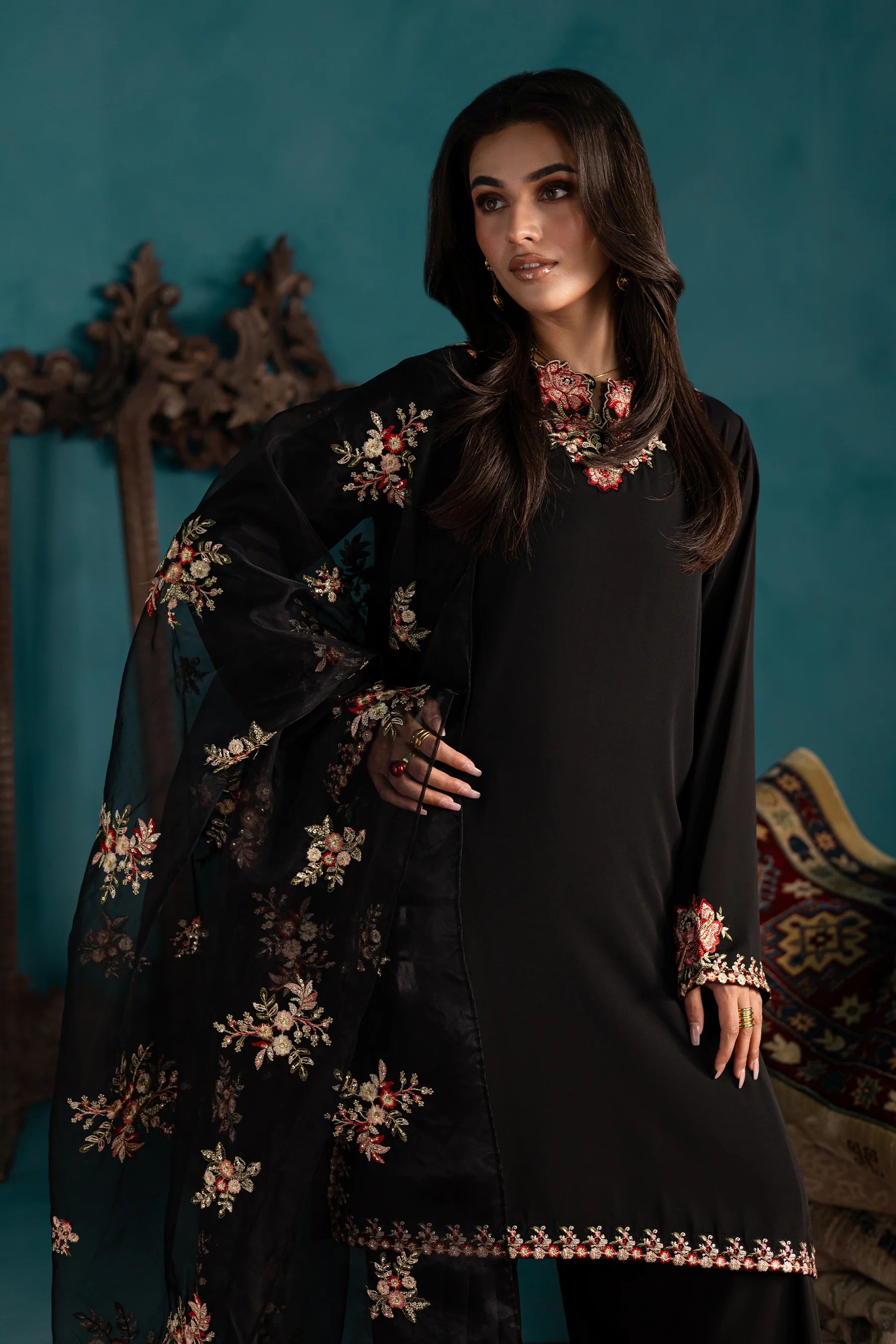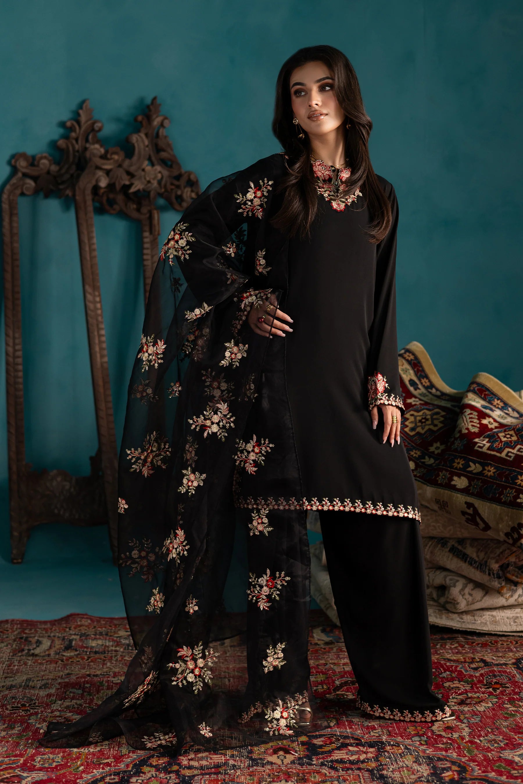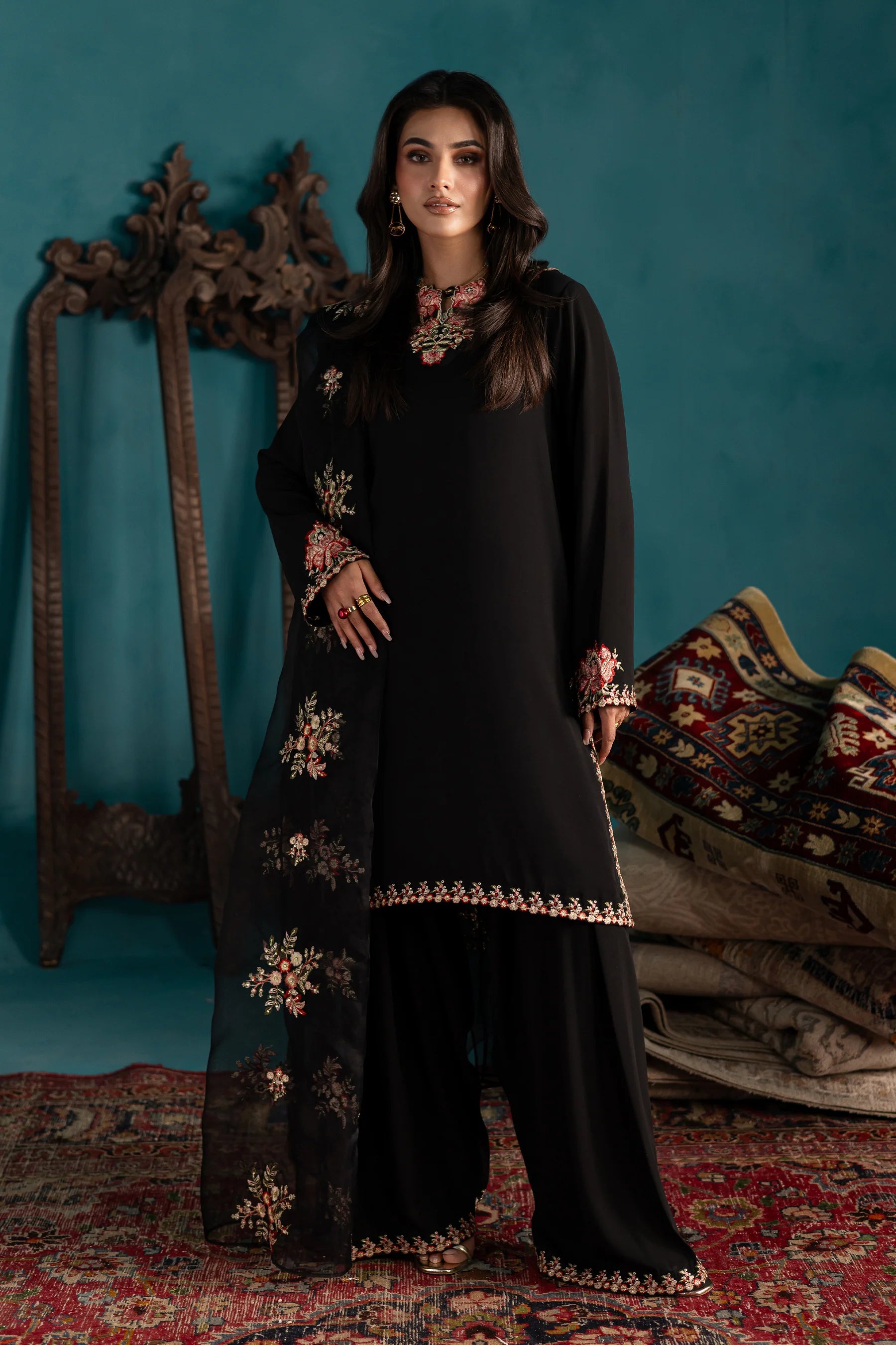 A short georgette black shirt featuring a beautifully embroidered neckline, enhanced with delicate kavia finishing for a refined touch. The shirt hem is detailed with a subtle 1” embroidered border, while the sleeves are adorned with a striking 4” composed embroidered border, adding a bold yet graceful statement.