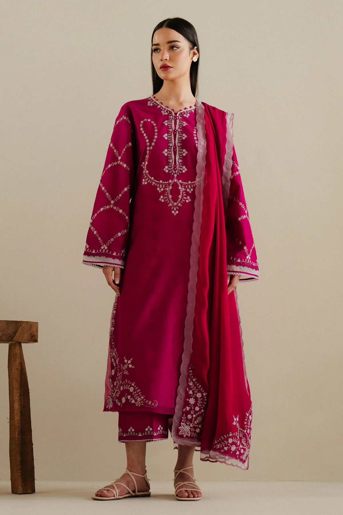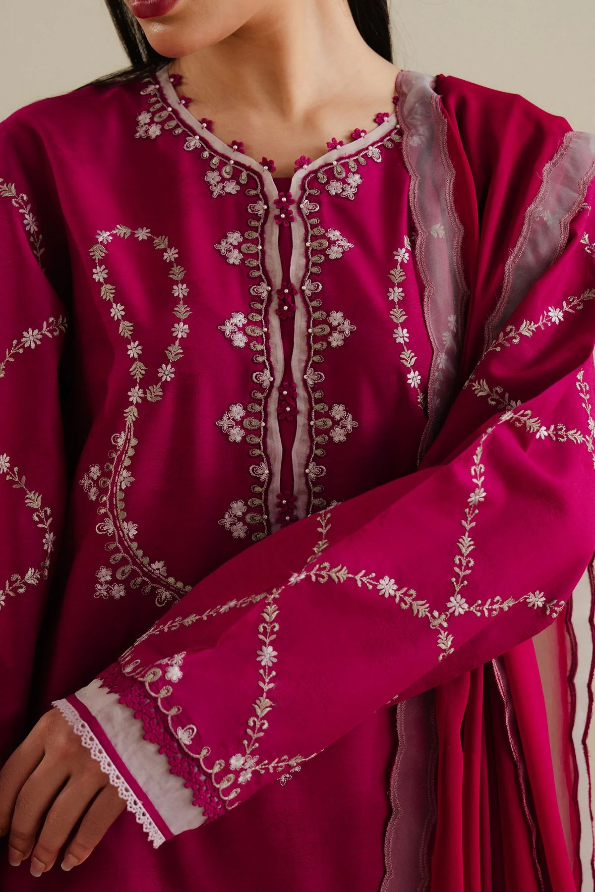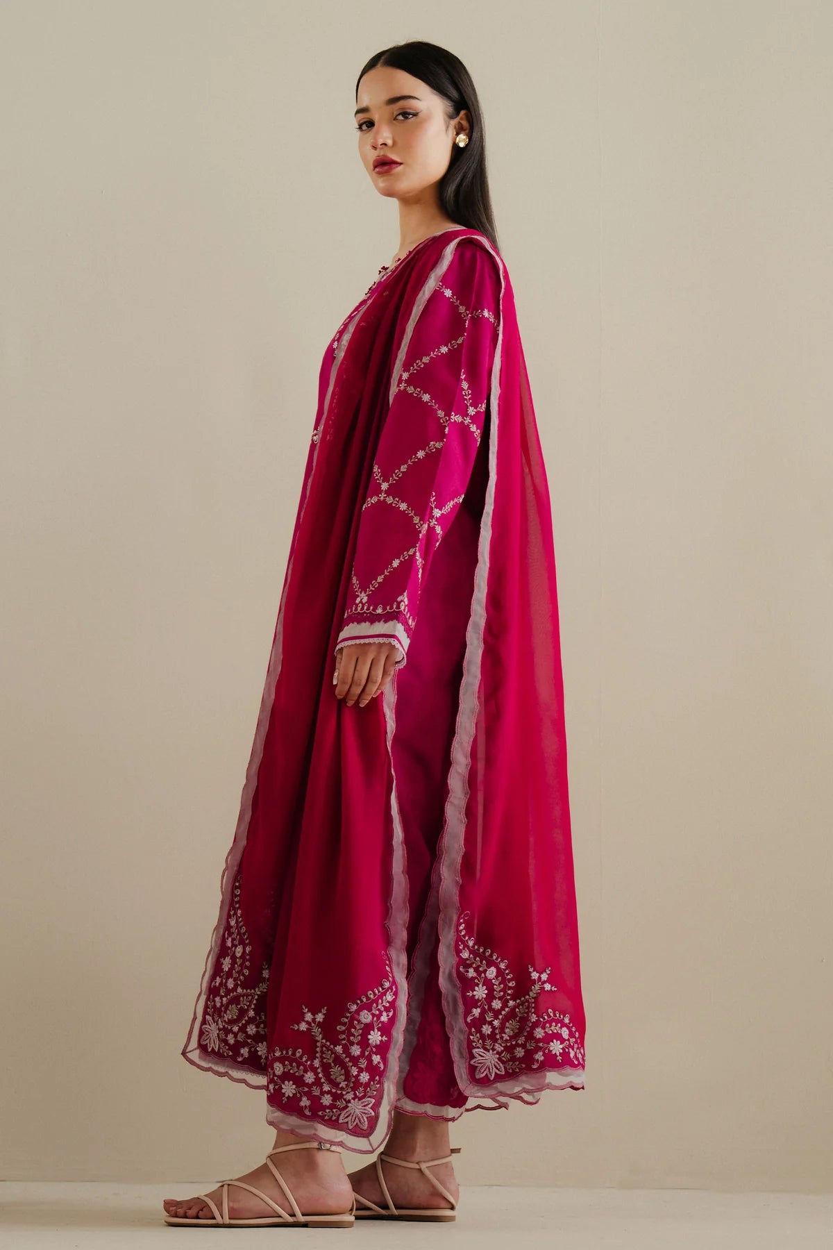 Our monochromatic outfit features a long-embroidered shirt with intricate details on the neckline and sleeves. It is paired with cropped wide-hem pants and an embroidered duppatta to complete the look