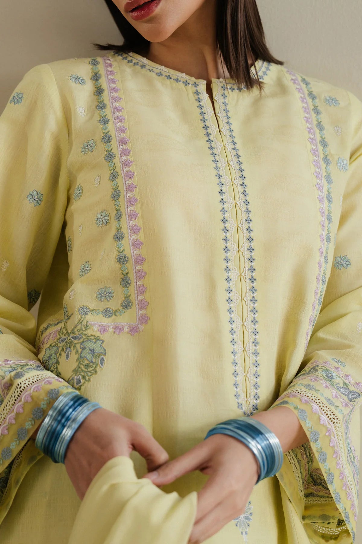 Our loose-fit paneled kurta features minimal embroidery details on the front and sleeves. It is paired with a heavily embroidered farshi shalwar and a tonal embroidered dupatta enhancing its monochromatic aesthetic.