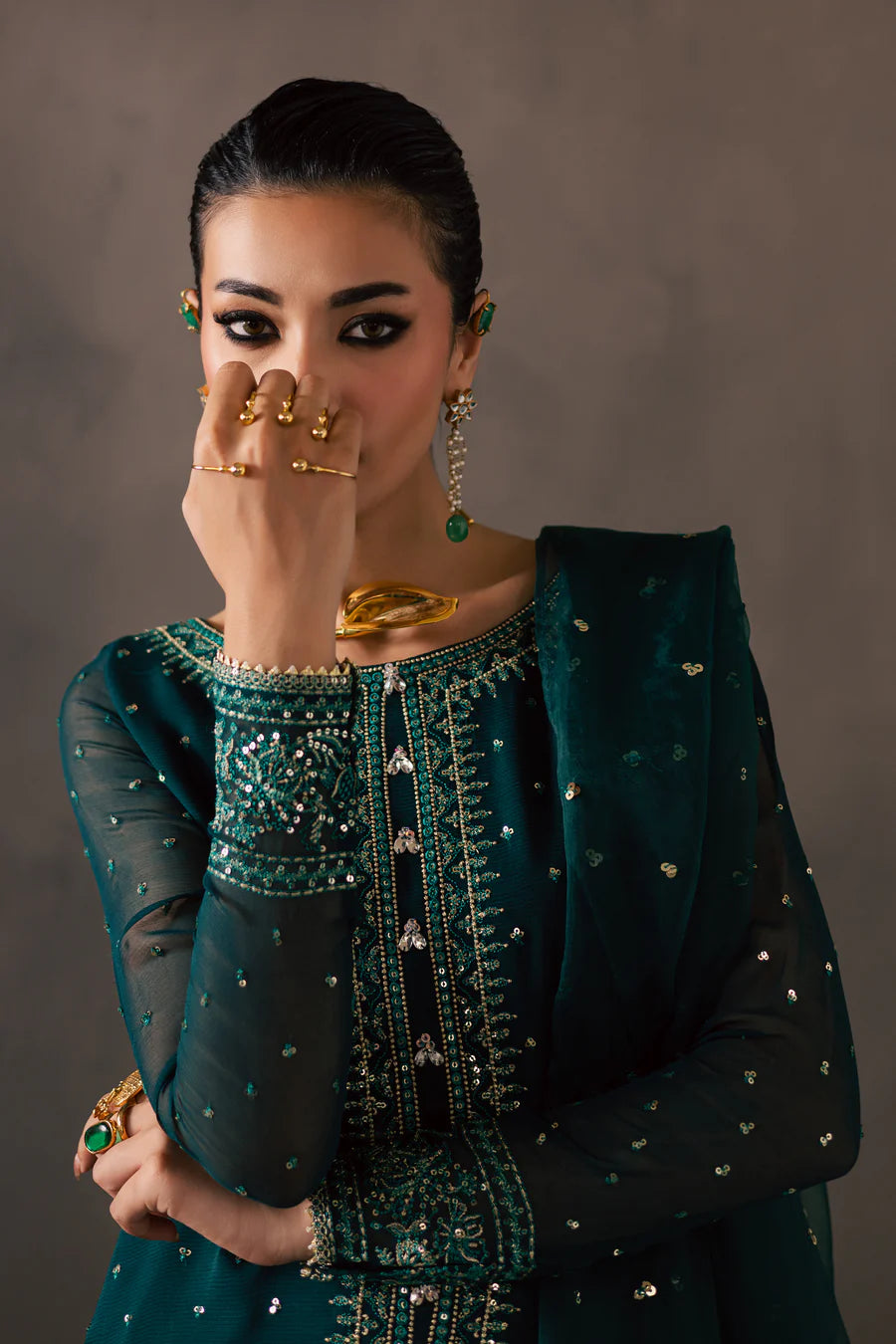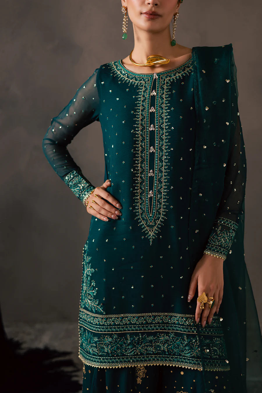 It is paired with a georgette sharara featuring elegant gold foil printing, adding a festive touch of shimmer and charm to the ensemble.