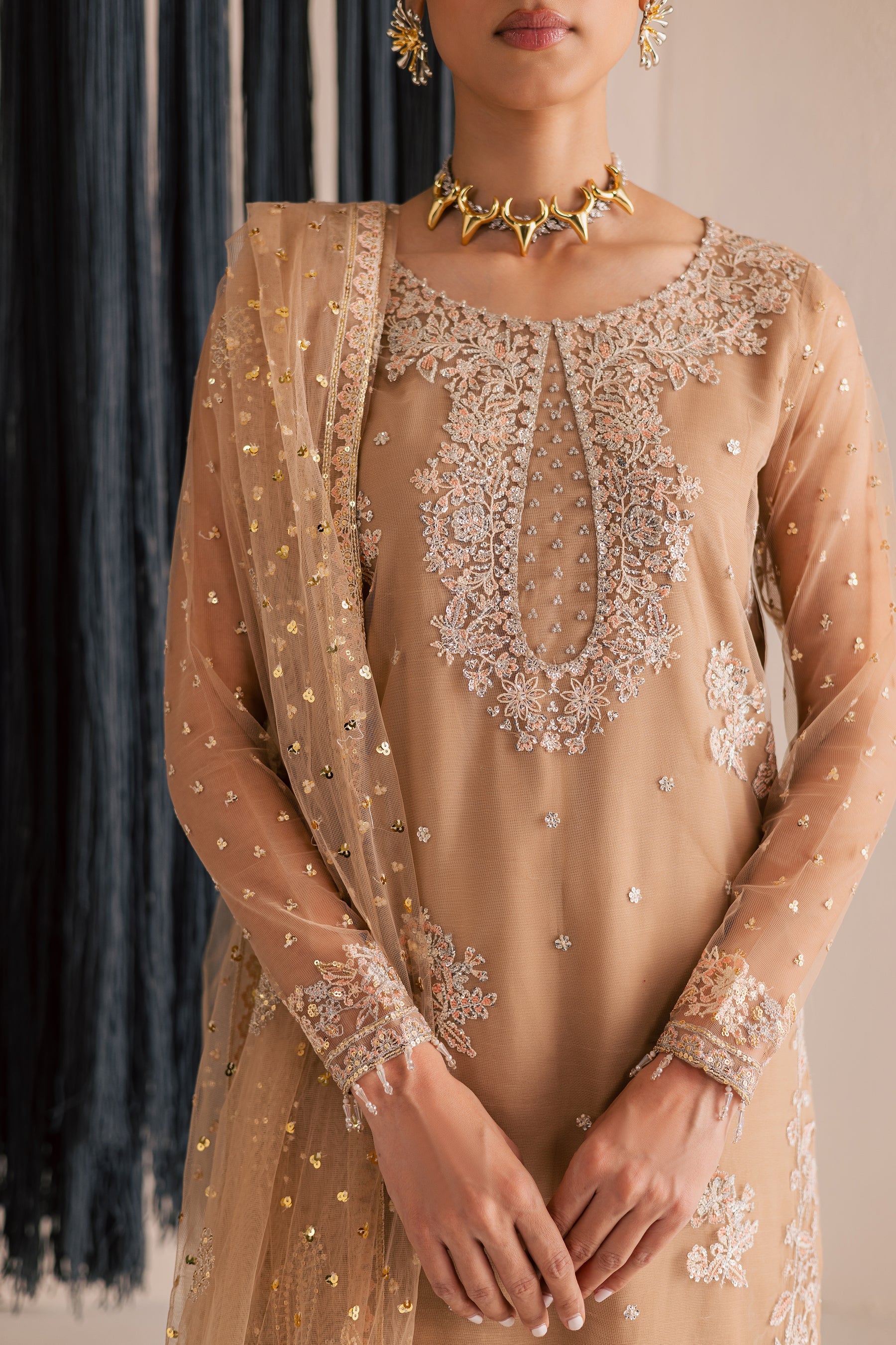 This sheer beige net shirt is beautifully crafted with delicate embroidery and sequin embellishments, creating a graceful and refined look. The straight-cut silhouette features intricate thread work around the neckline, hand embellishments, and an embroidered hem, while the composed embroidery on the front adds a touch of timeless elegance.