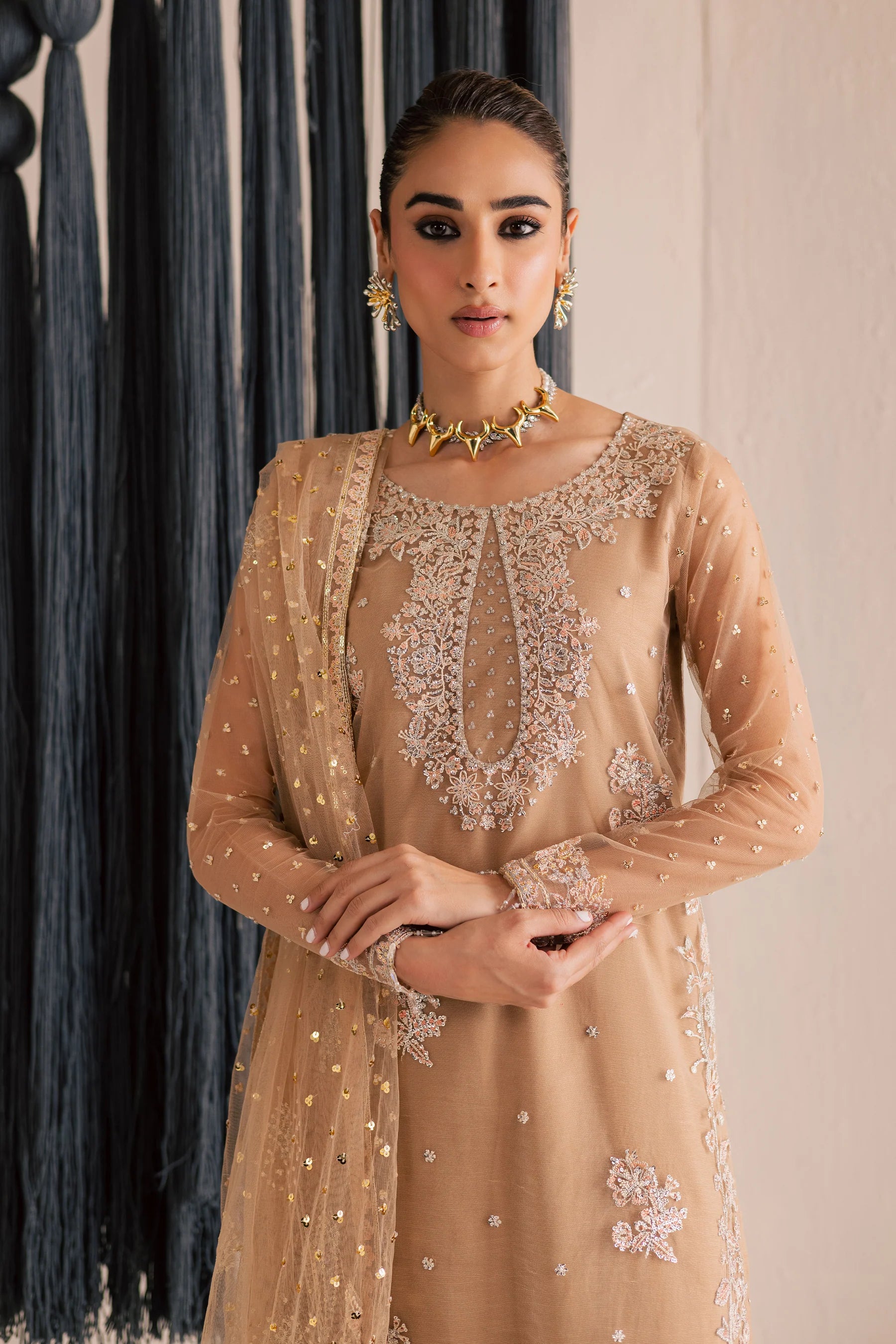 Completing the ensemble is a sheer net dupatta, subtly scattered with shimmering accents for a light, graceful finish.