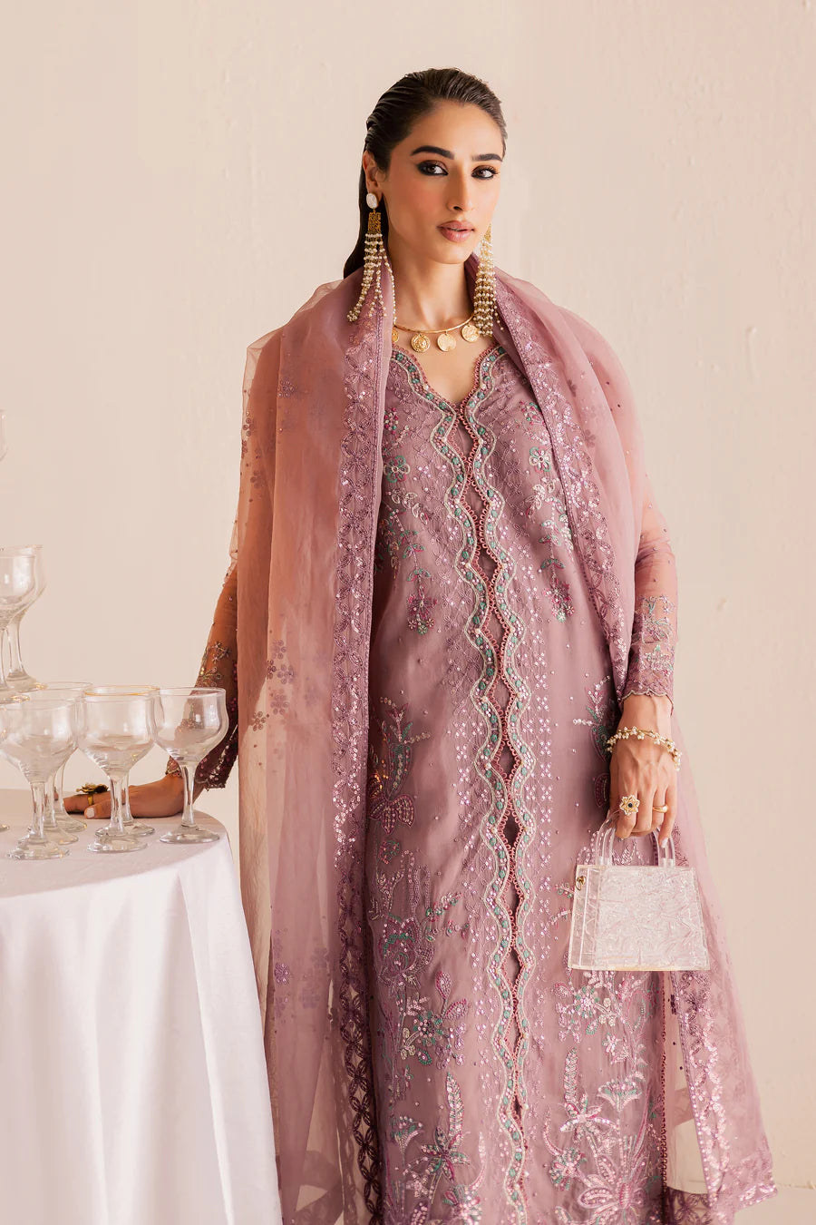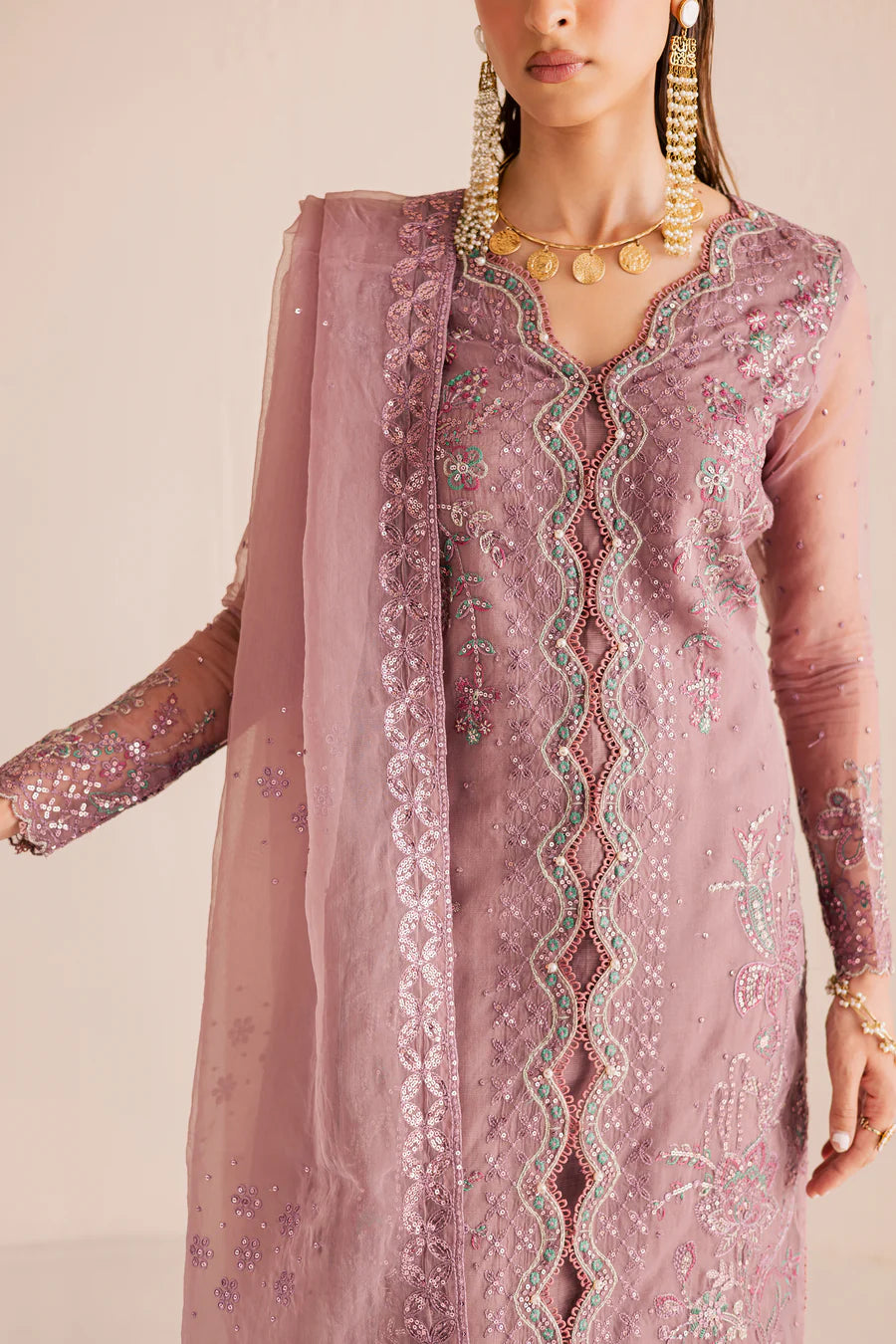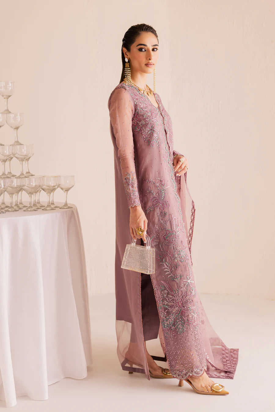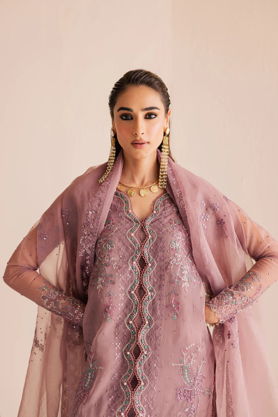 Exude timeless elegance in this exquisite lilac organza ensemble, featuring delicate embroidery that cascades gracefully down the front. The sheer, full-length sleeves lend an ethereal charm, while the scalloped neckline and intricately embellished borders enhance the refined silhouette.