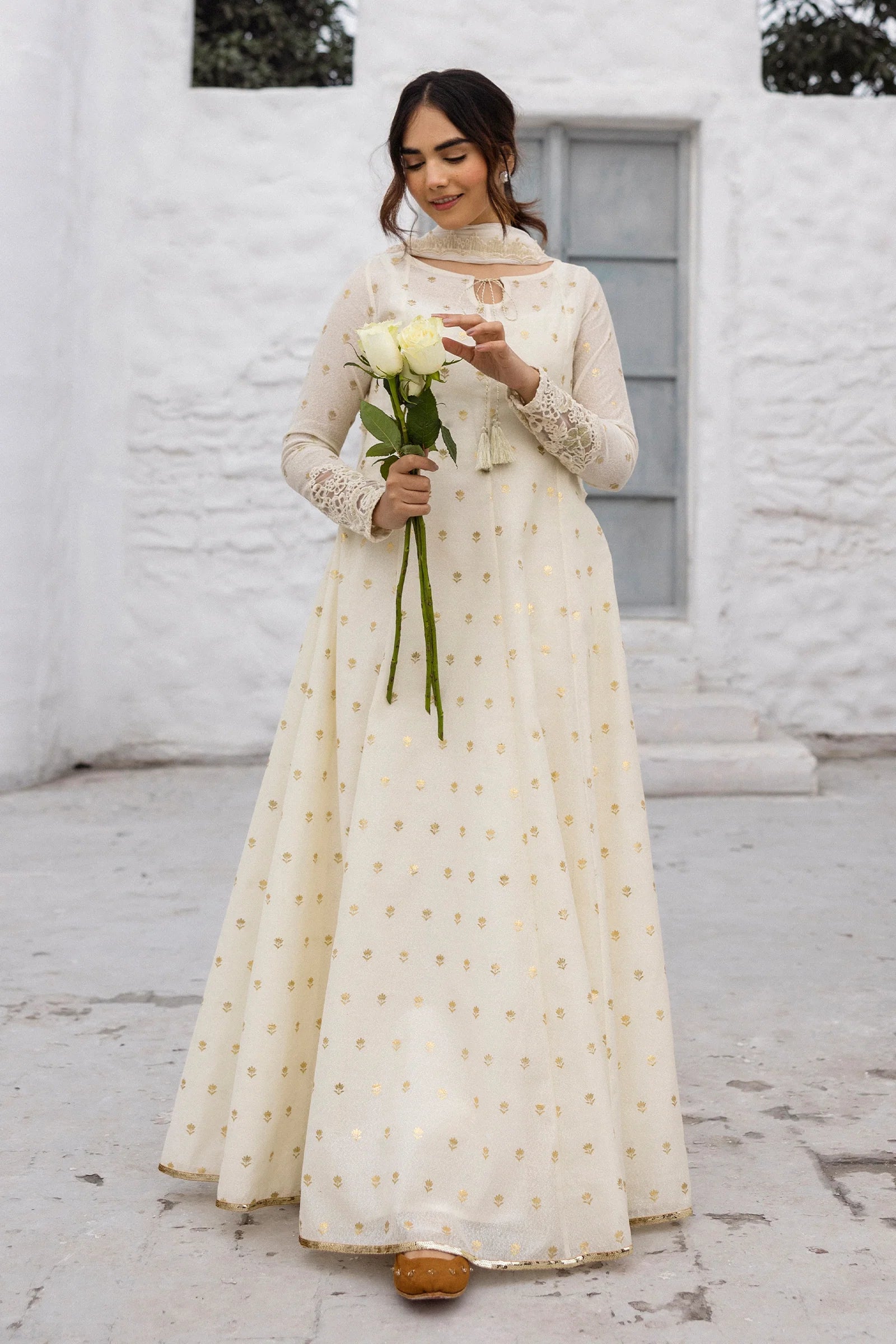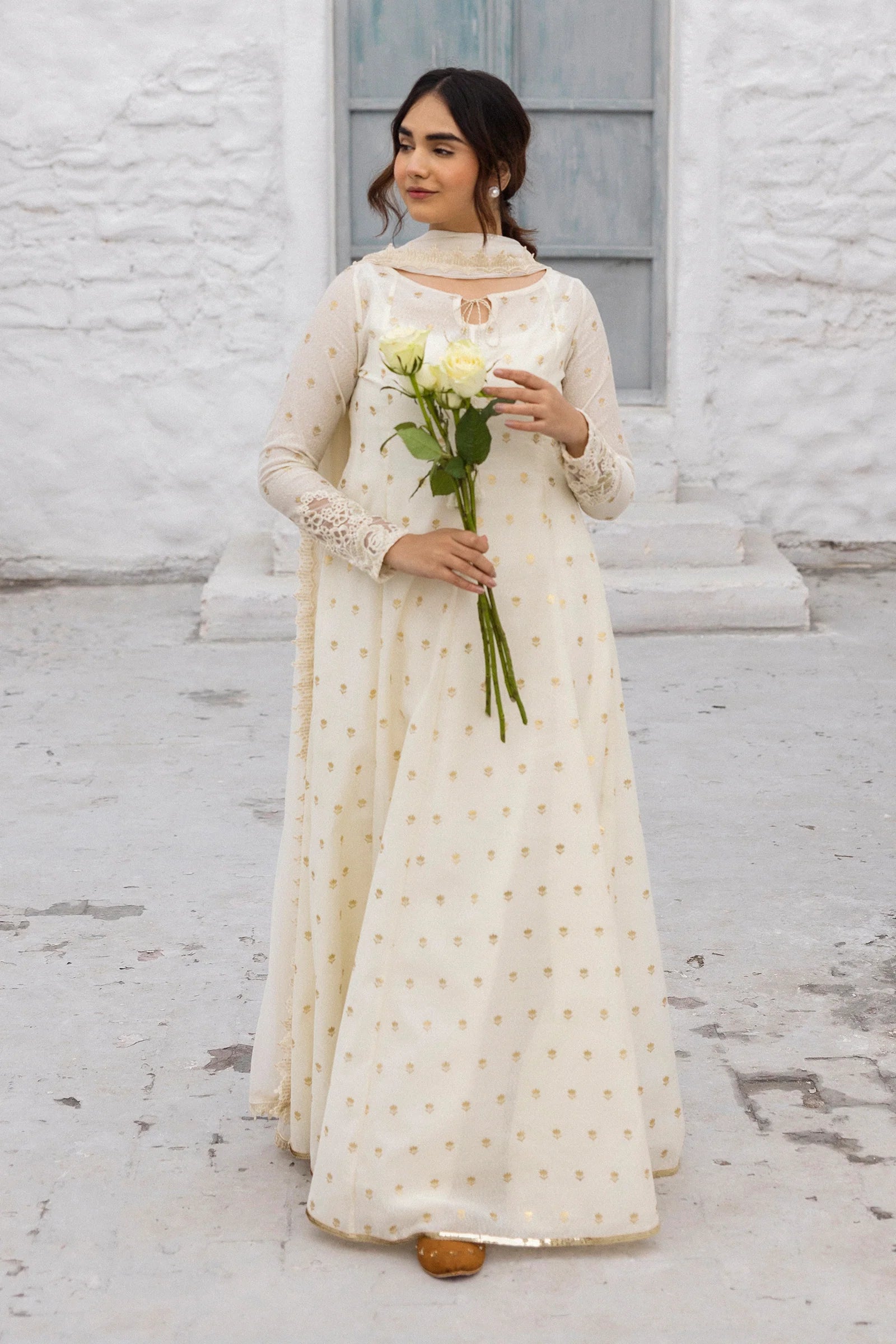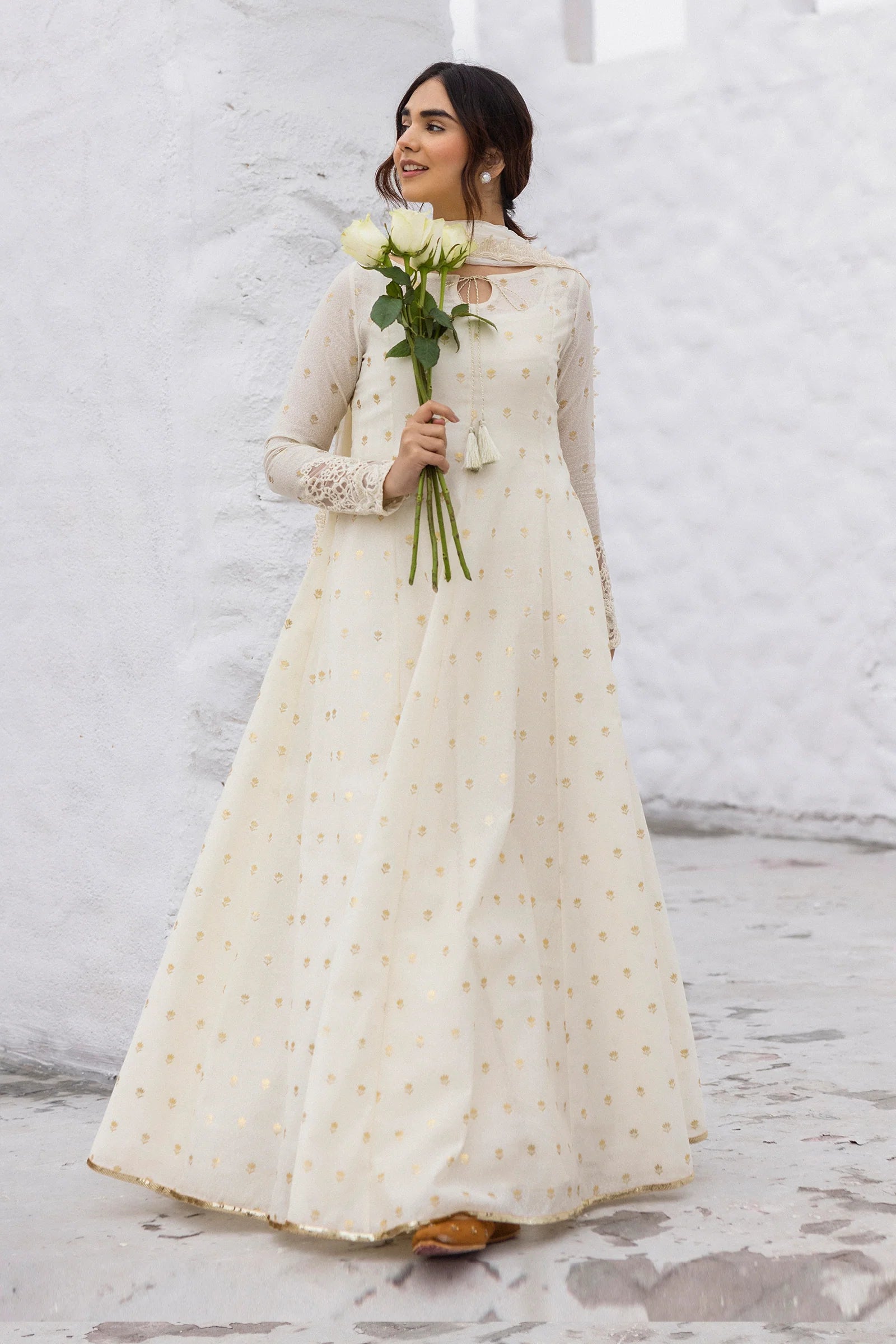 Description: This elegant outfit is crafted from premium cotton karandi in a timeless pearl white color, enhanced...
