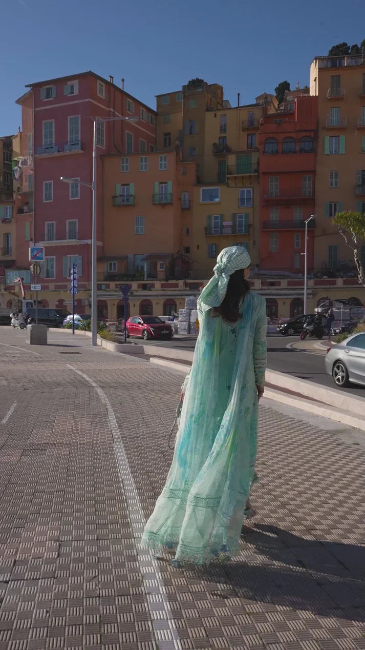 A three piece printed set in hues of aqua and mint. Making the perfect color to wear this season. Cobalt blue highlighted elements in the print to create the perfect balance. With off-white aari embroidery inspired neckline and organza borders to finish the look effortlessly.