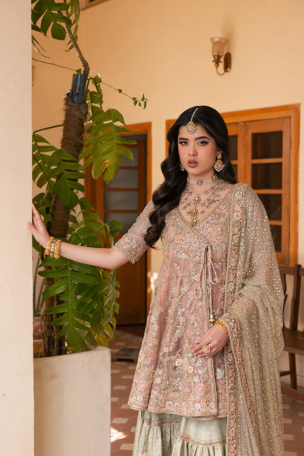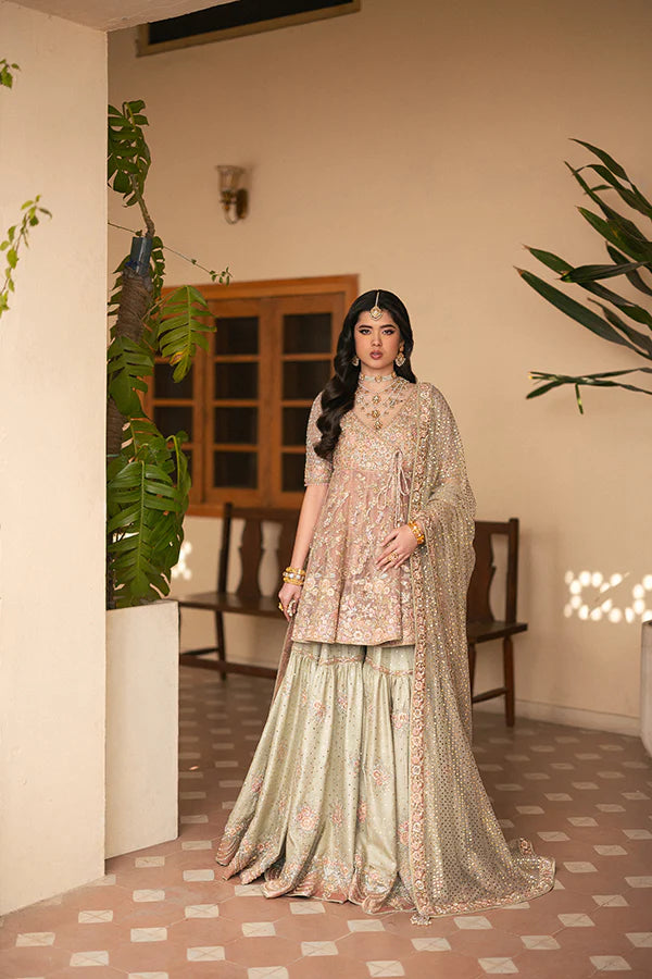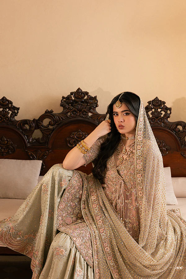 Like morning dew on rose petals, our Salmon pink angrakha shines with delicate beauty, paired with a flowing sage green gharara that rustles with secrets. A sheer mukaish dupatta floats, a whispered promise of elegance.