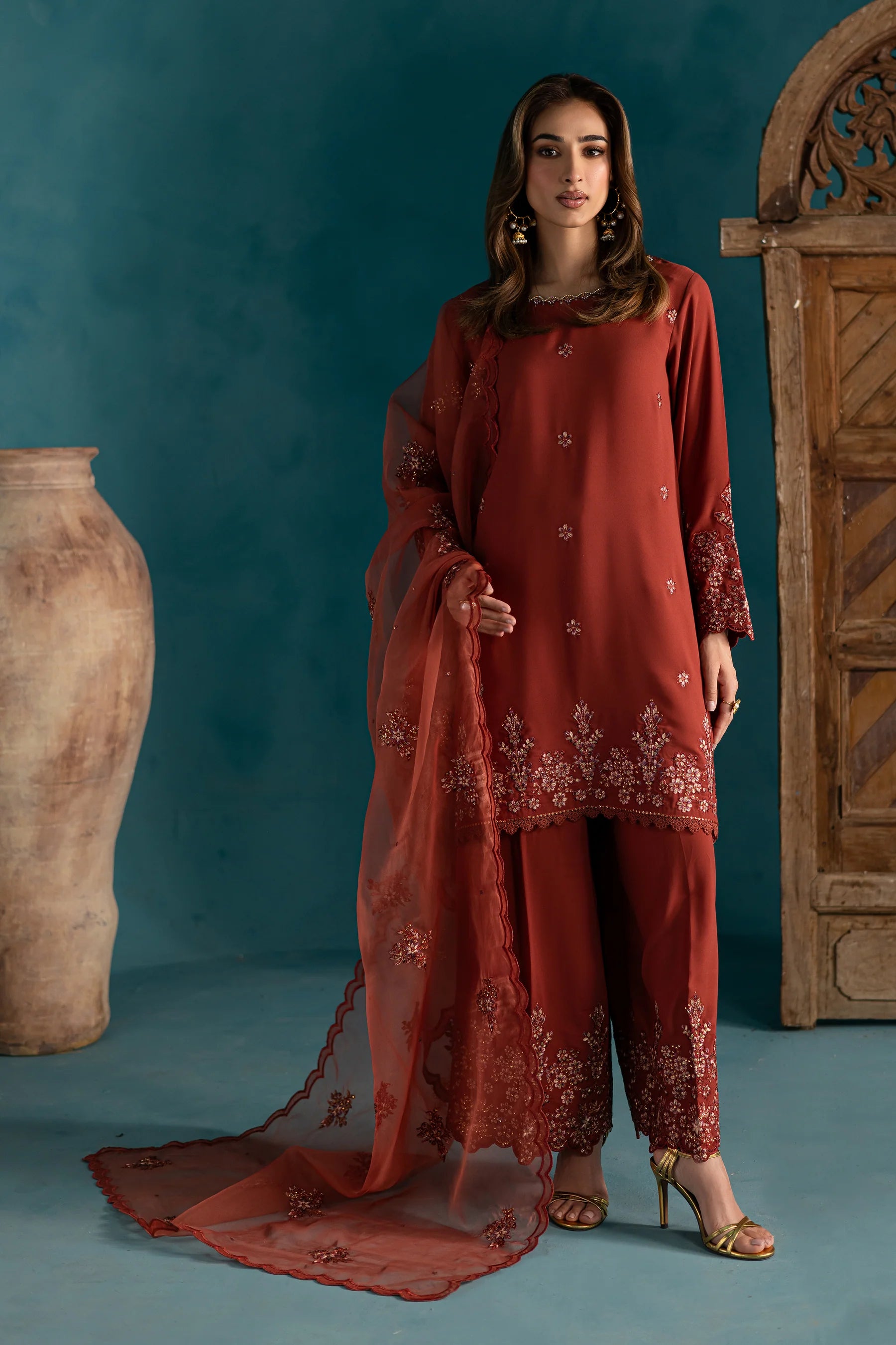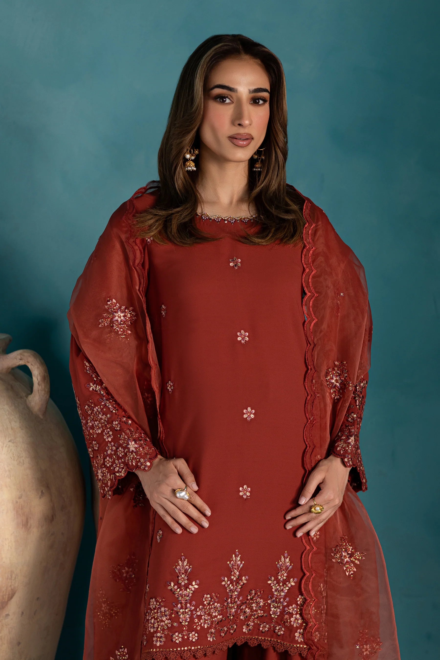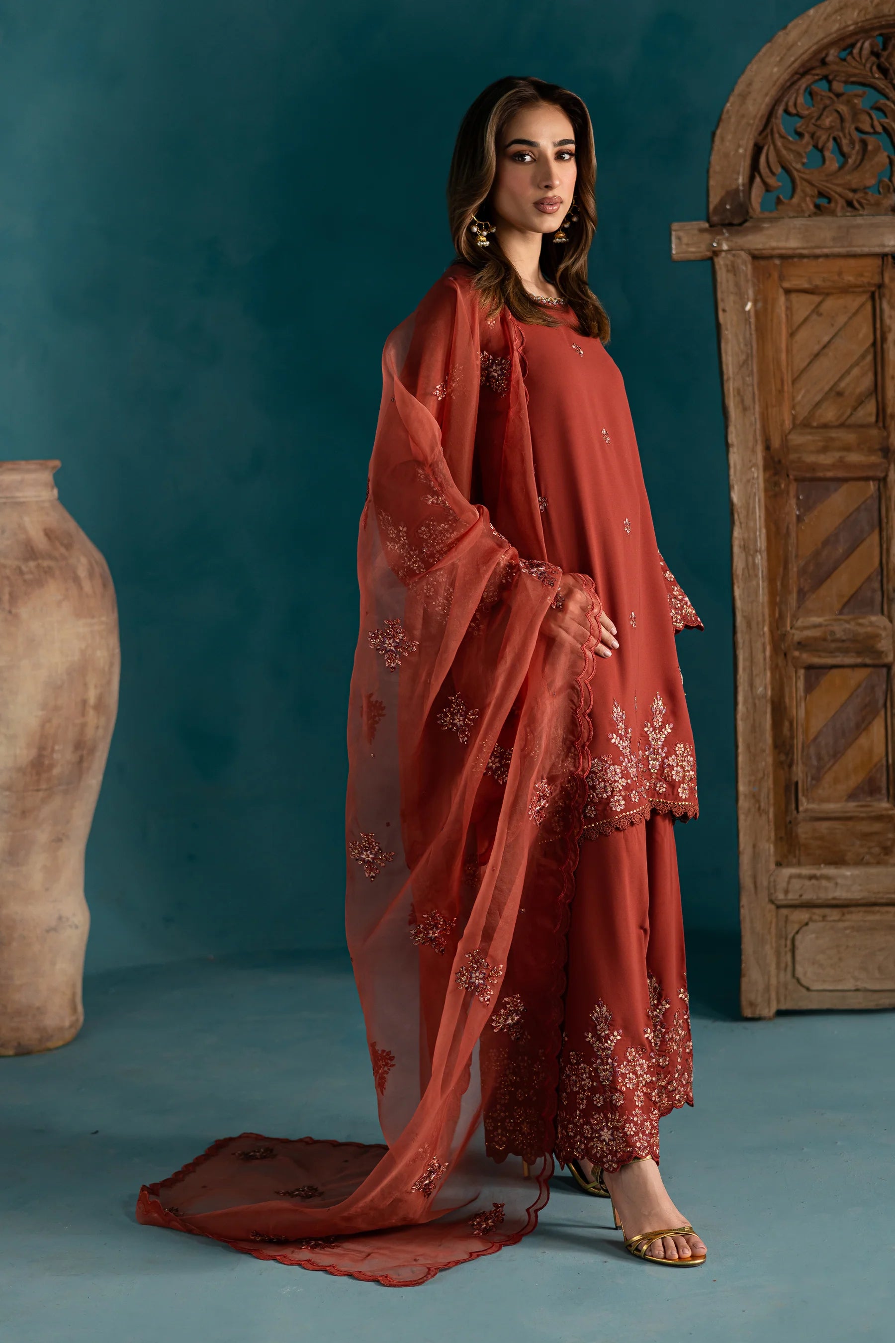 The look is completed with a statement organza dupatta in rich three-tone darker shades. An embroidered spread at the center adds visual interest, while scalloped finishing on all four sides brings the ensemble together with elegance and flair.