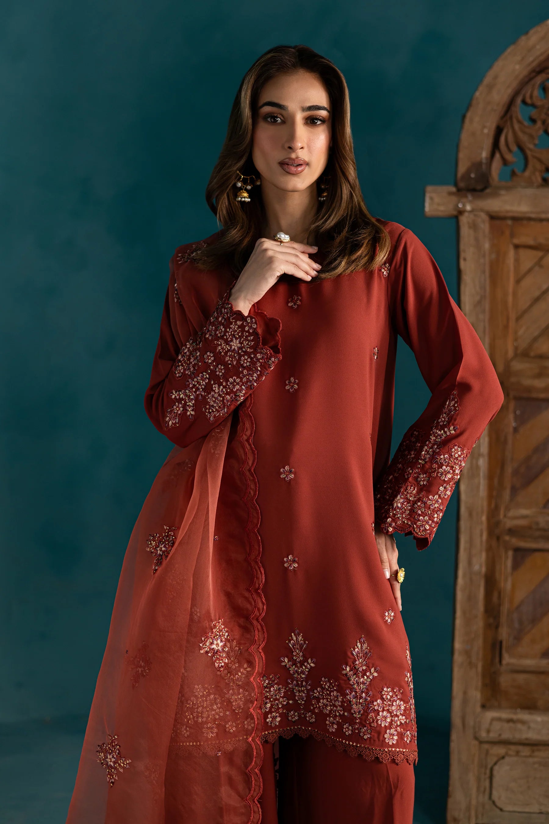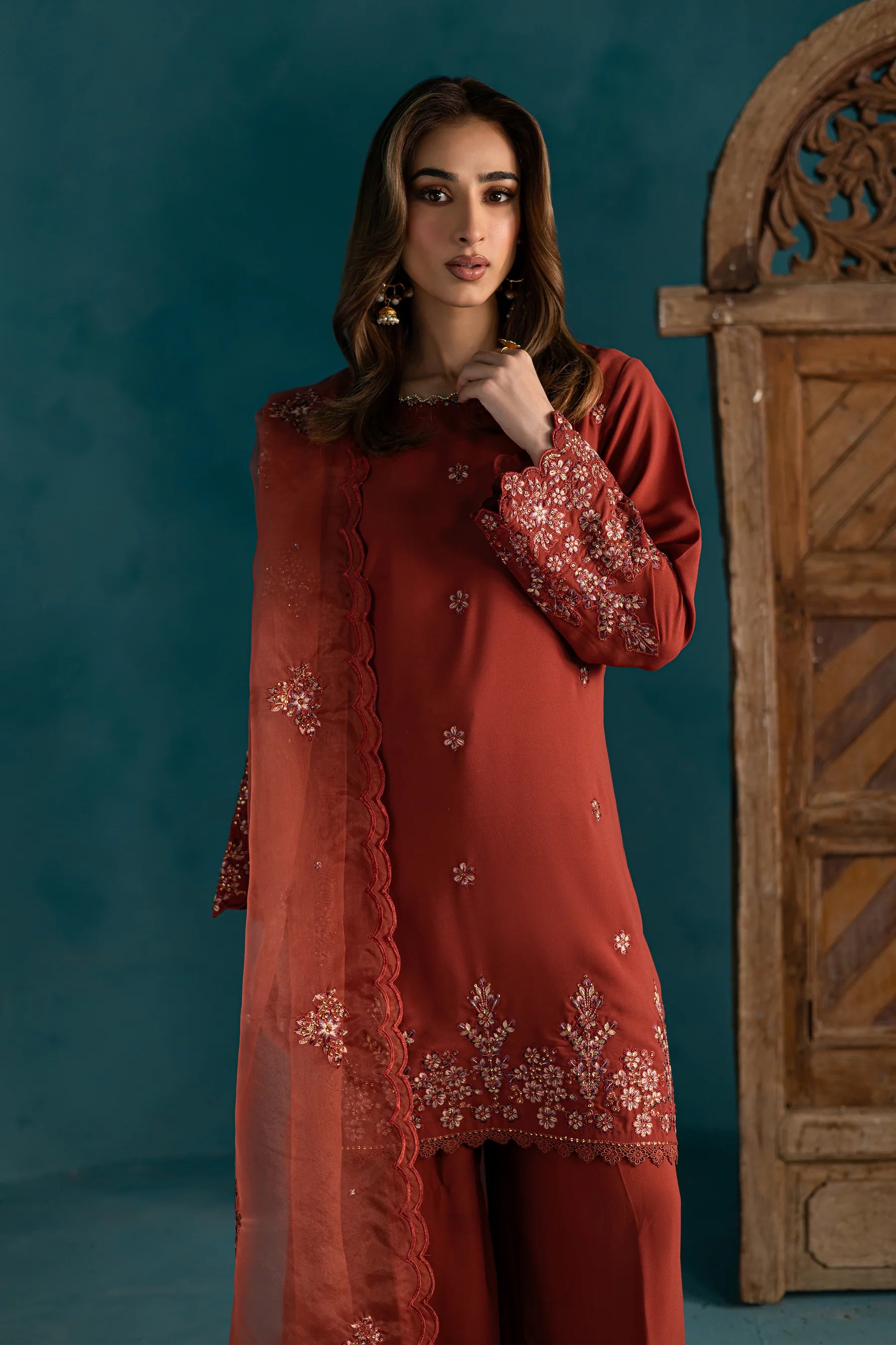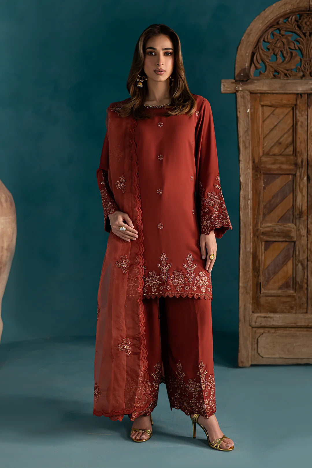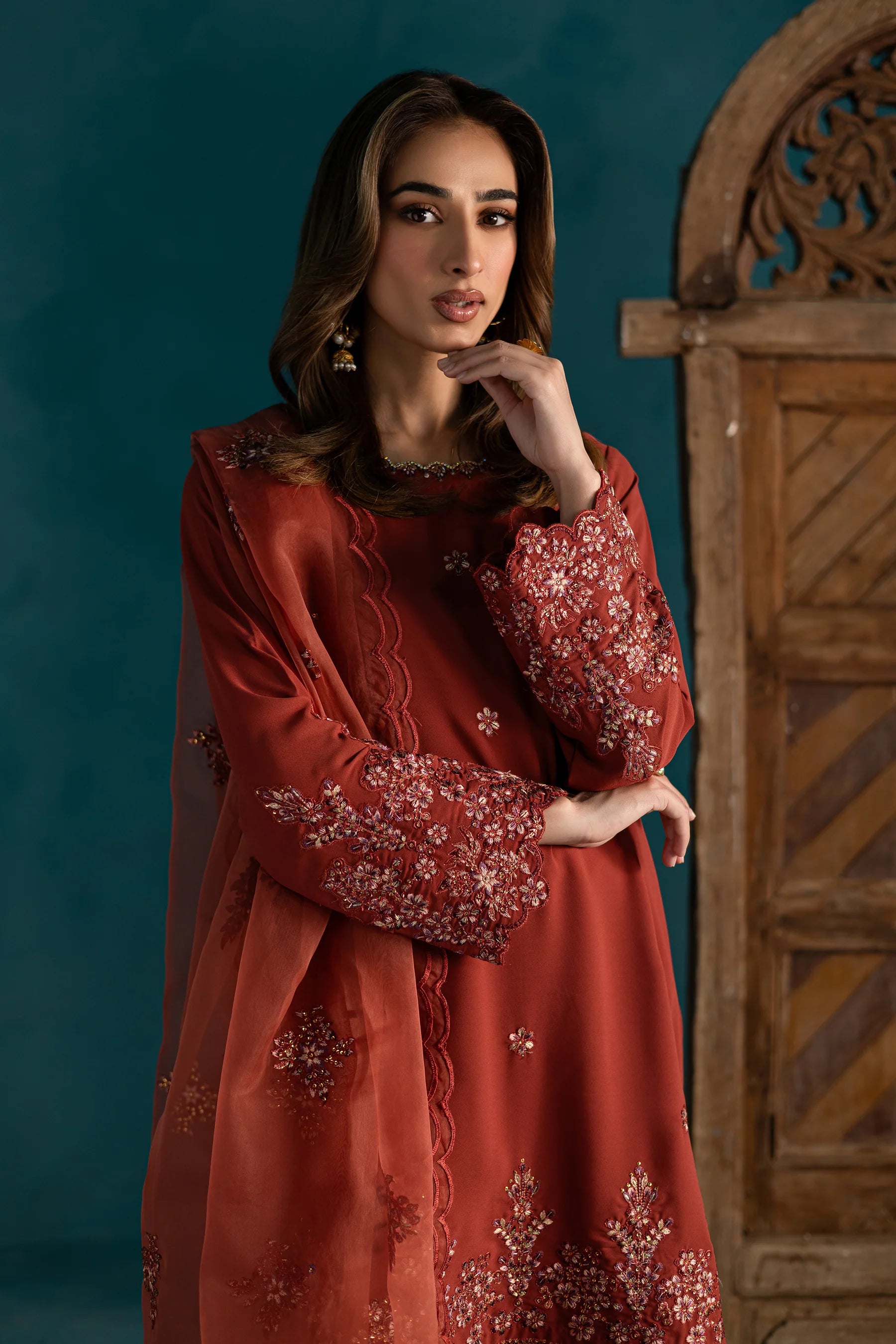 The look is completed with a statement organza dupatta in rich three-tone darker shades. An embroidered spread at the center adds visual interest, while scalloped finishing on all four sides brings the ensemble together with elegance and flair.