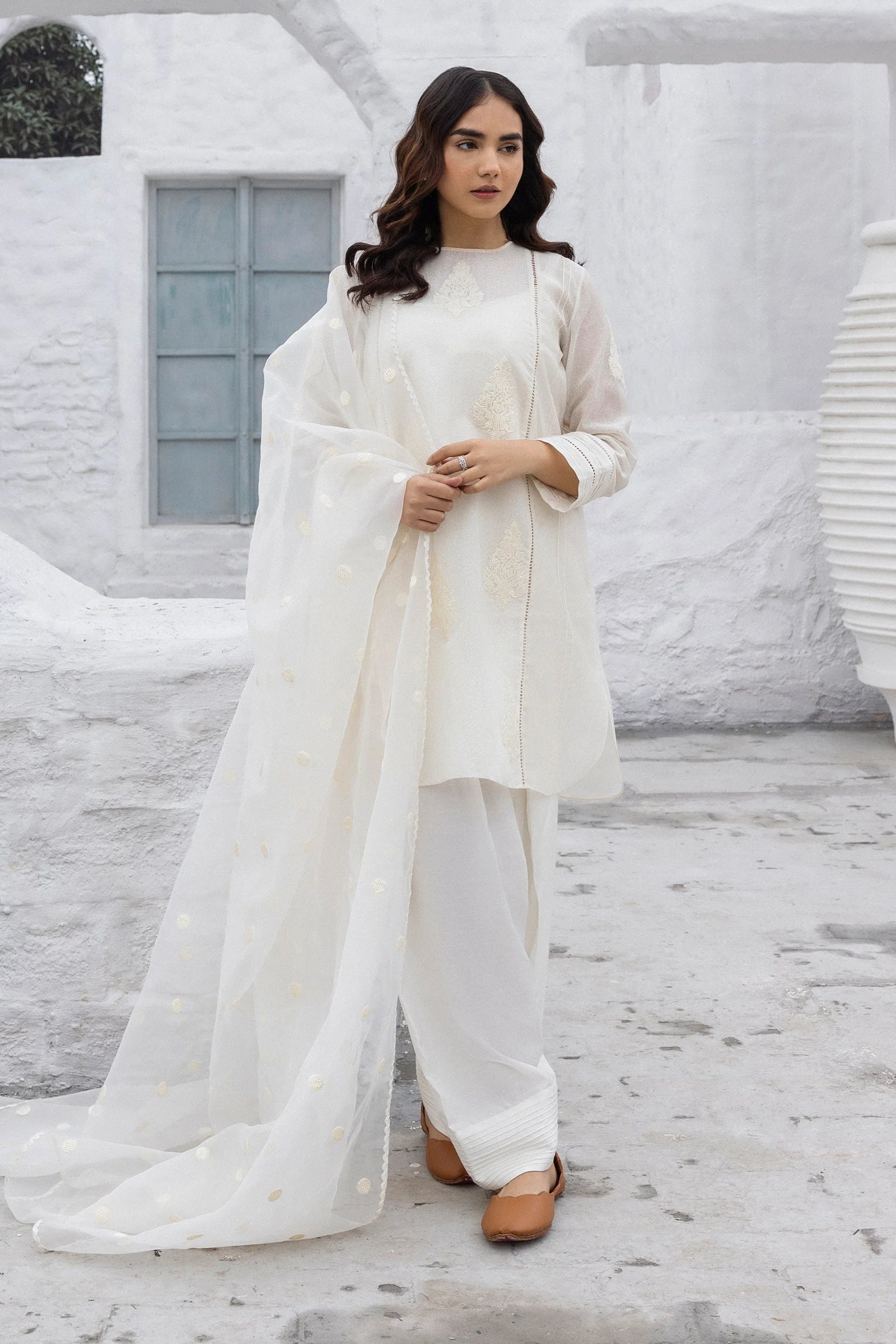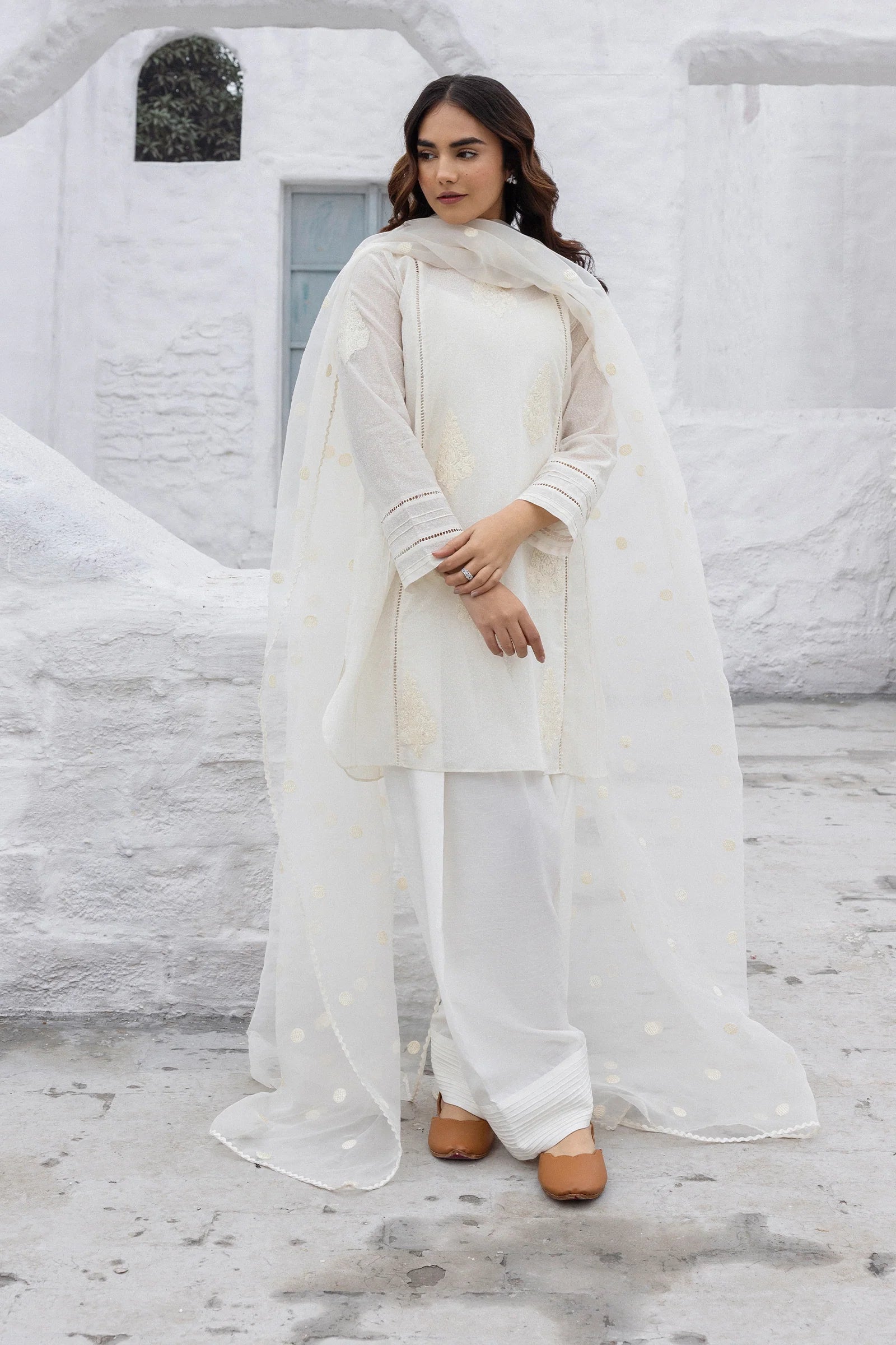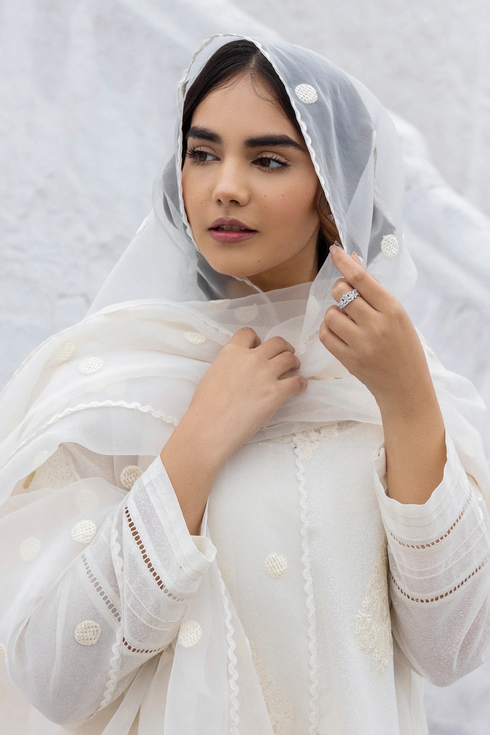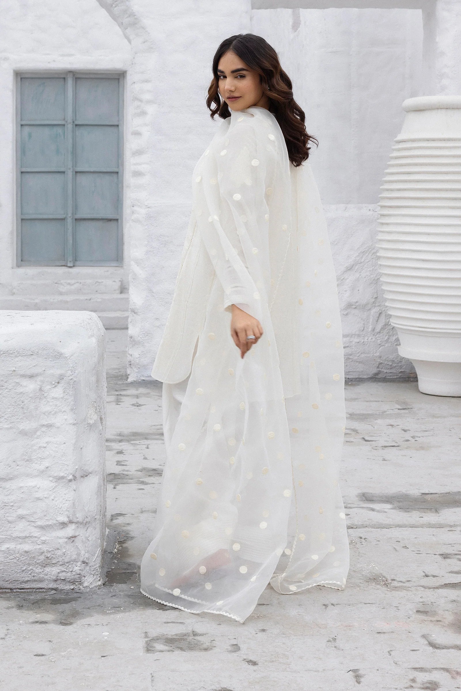 This exquisite outfit is crafted from premium cotton karandi fabric in a serene pearl white shade, enhanced with delicate sequin and silk thread embroidery. The ensemble is paired with a beautifully embroidered organza dupatta adorned with charming polka dots, adding a graceful touch. The stitching features elegant pleats and intricate seri lace insertions for added sophistication. Completing the look is a stylish Korean silk shalwar, offering a perfect balance of comfort and luxury.