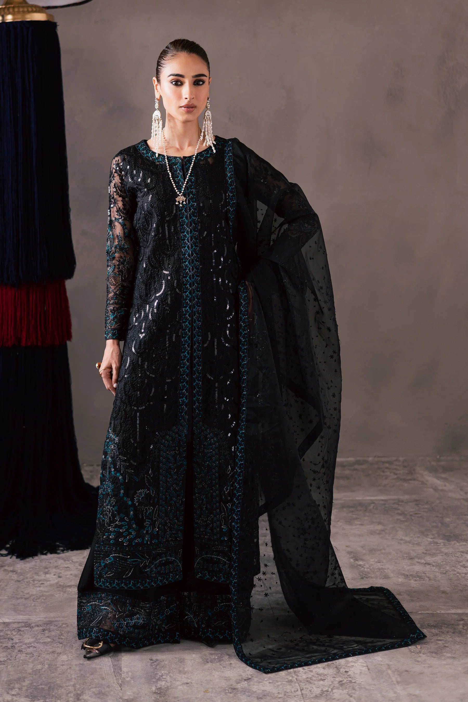 This striking ensemble features a black organza front-open shirt with an inner lining, richly adorned with intricate embroidery spread across the fabric. Teal threadwork adds a beautiful contrast and depth, enhancing the elegance of the design.