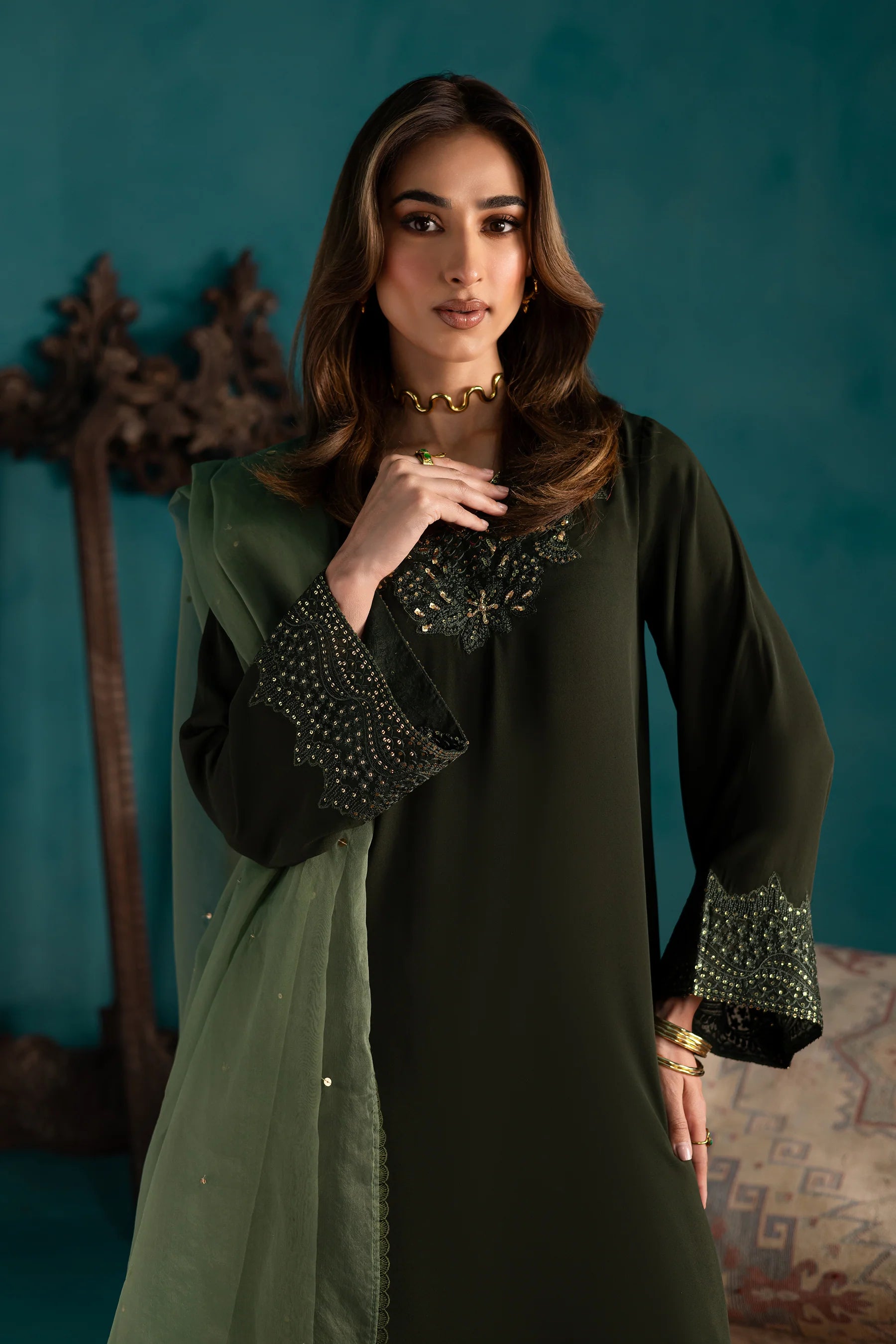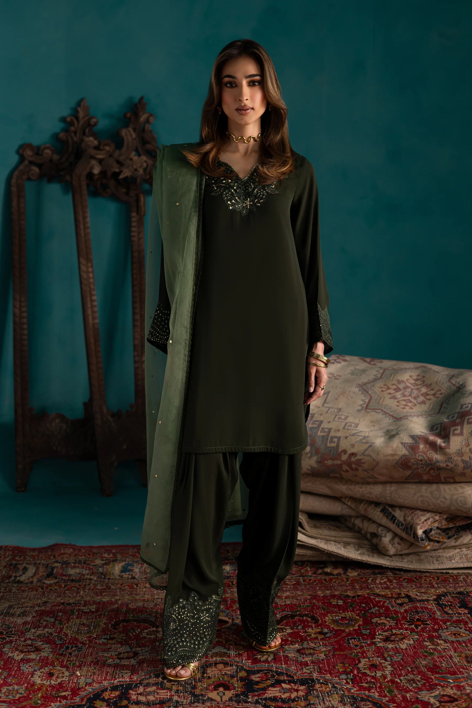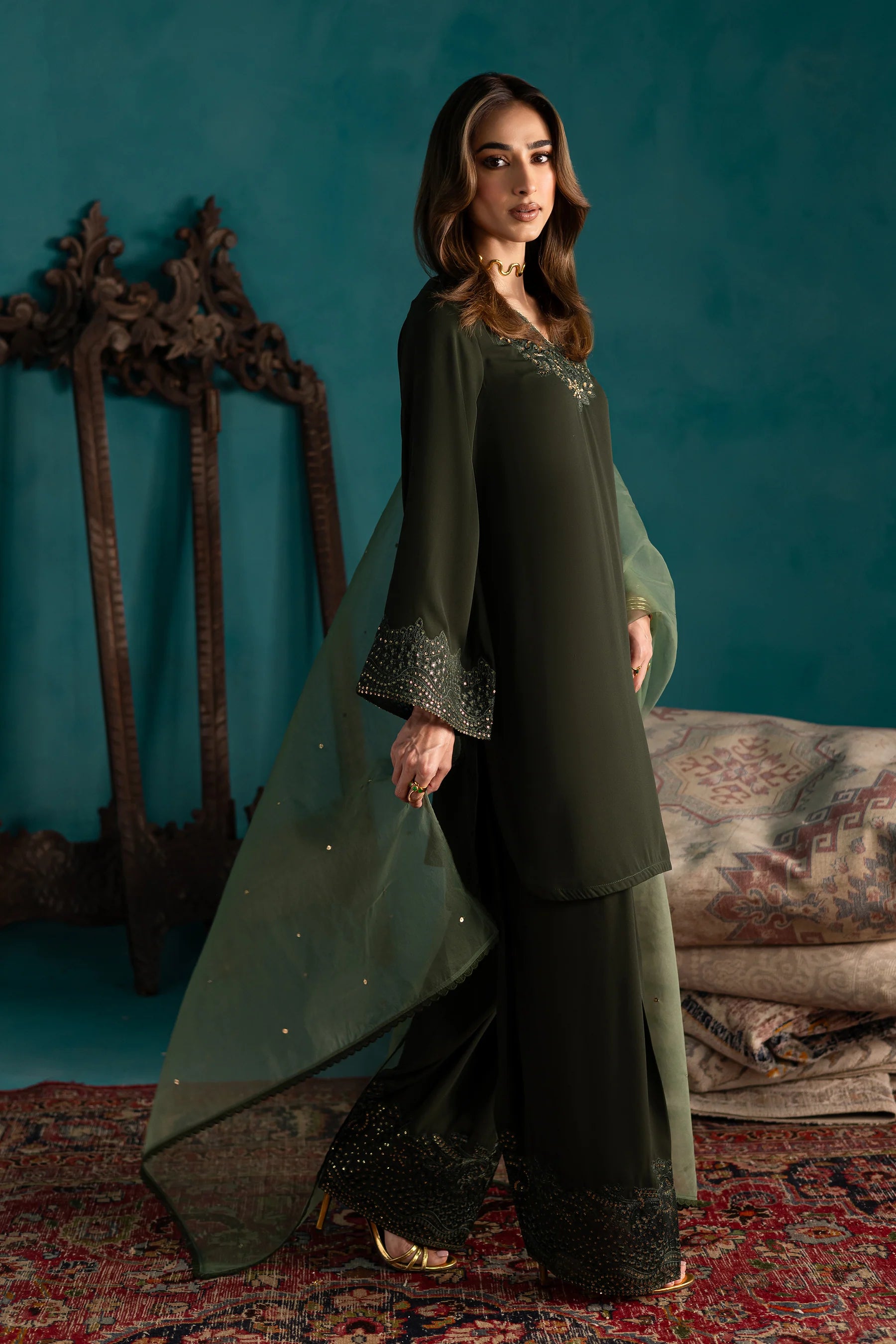 This dark army green georgette shirt features an intricately embroidered neckline, paired with subtly adda-embellished sleeves finished with a clean self-fold edge. The shirt hem also carries the same self-fold finishing, offering a neat and minimal look with refined detailing.