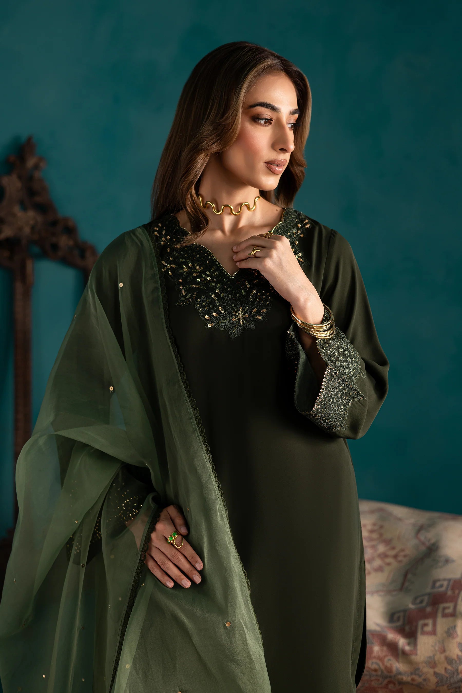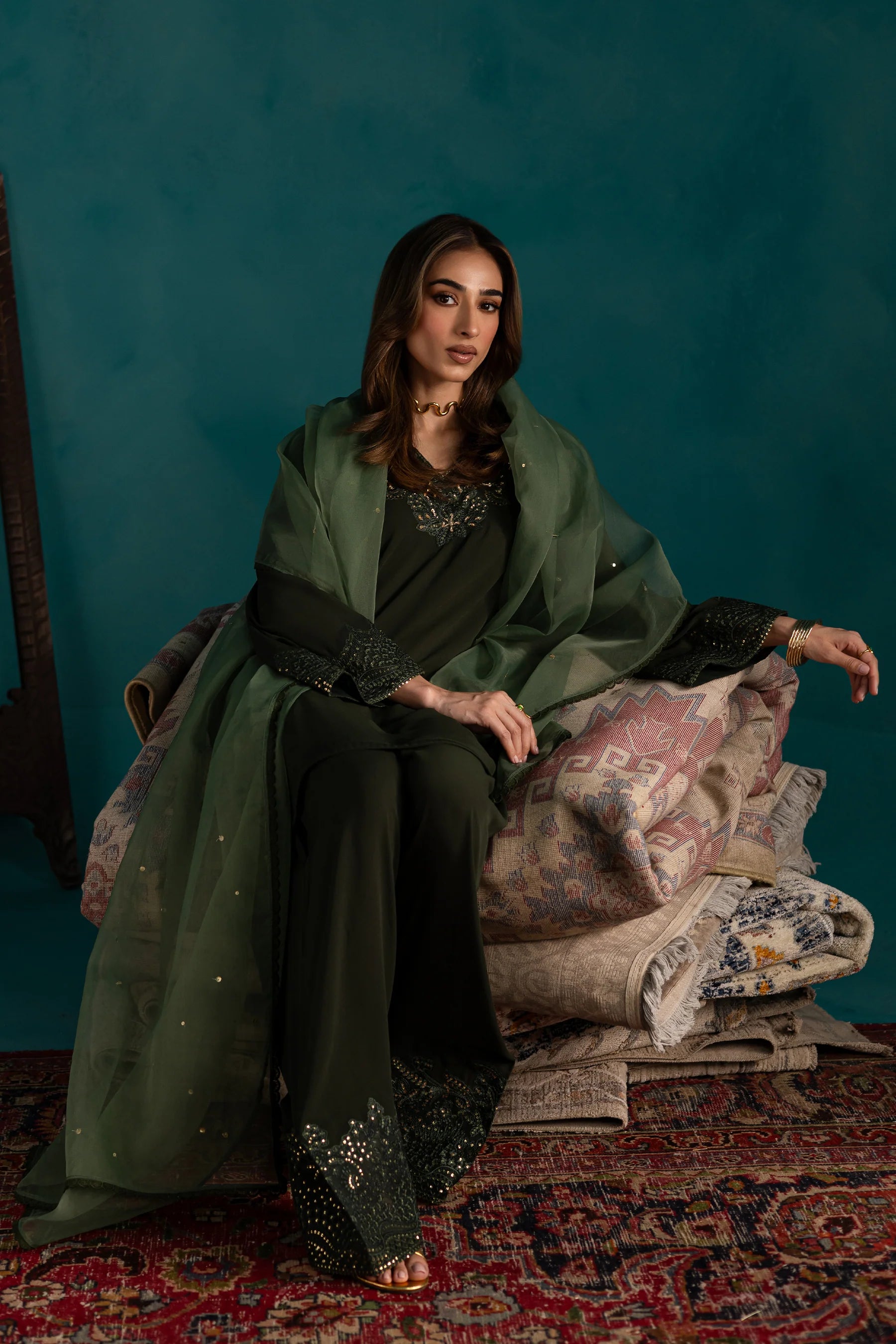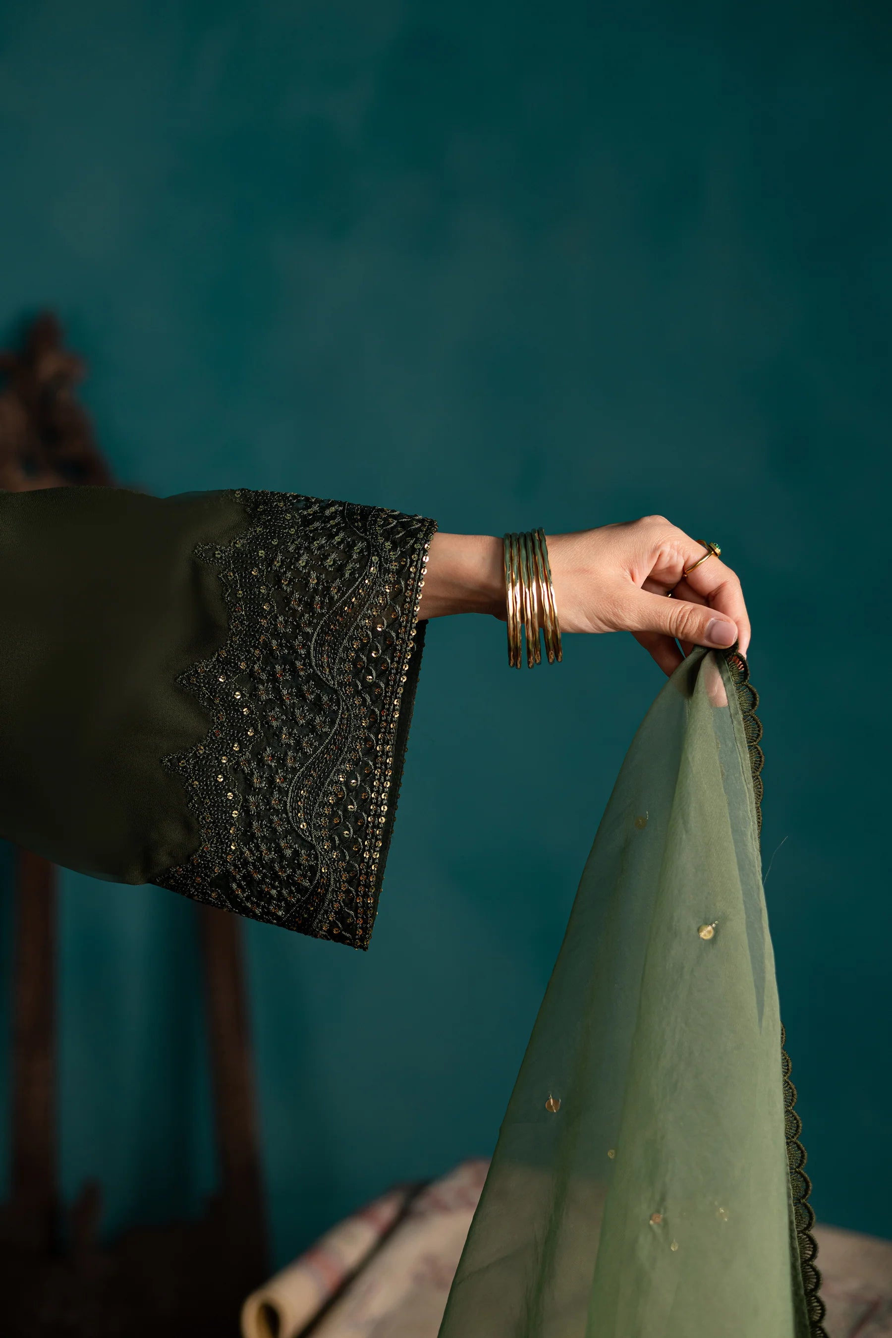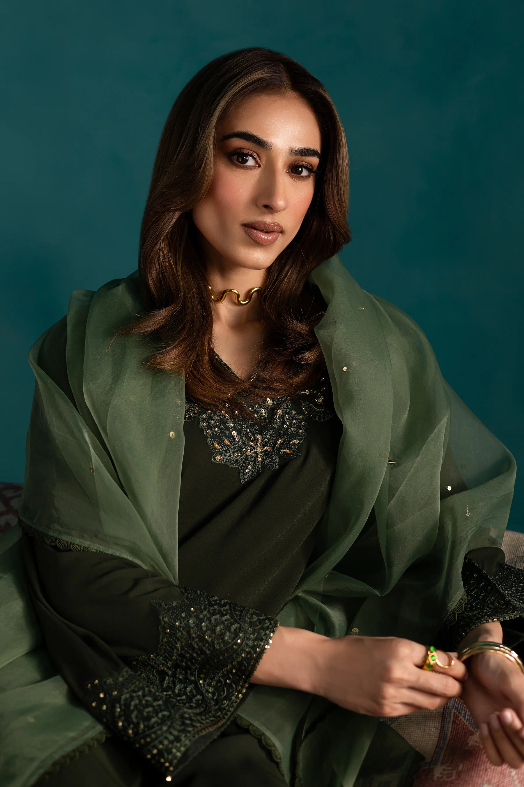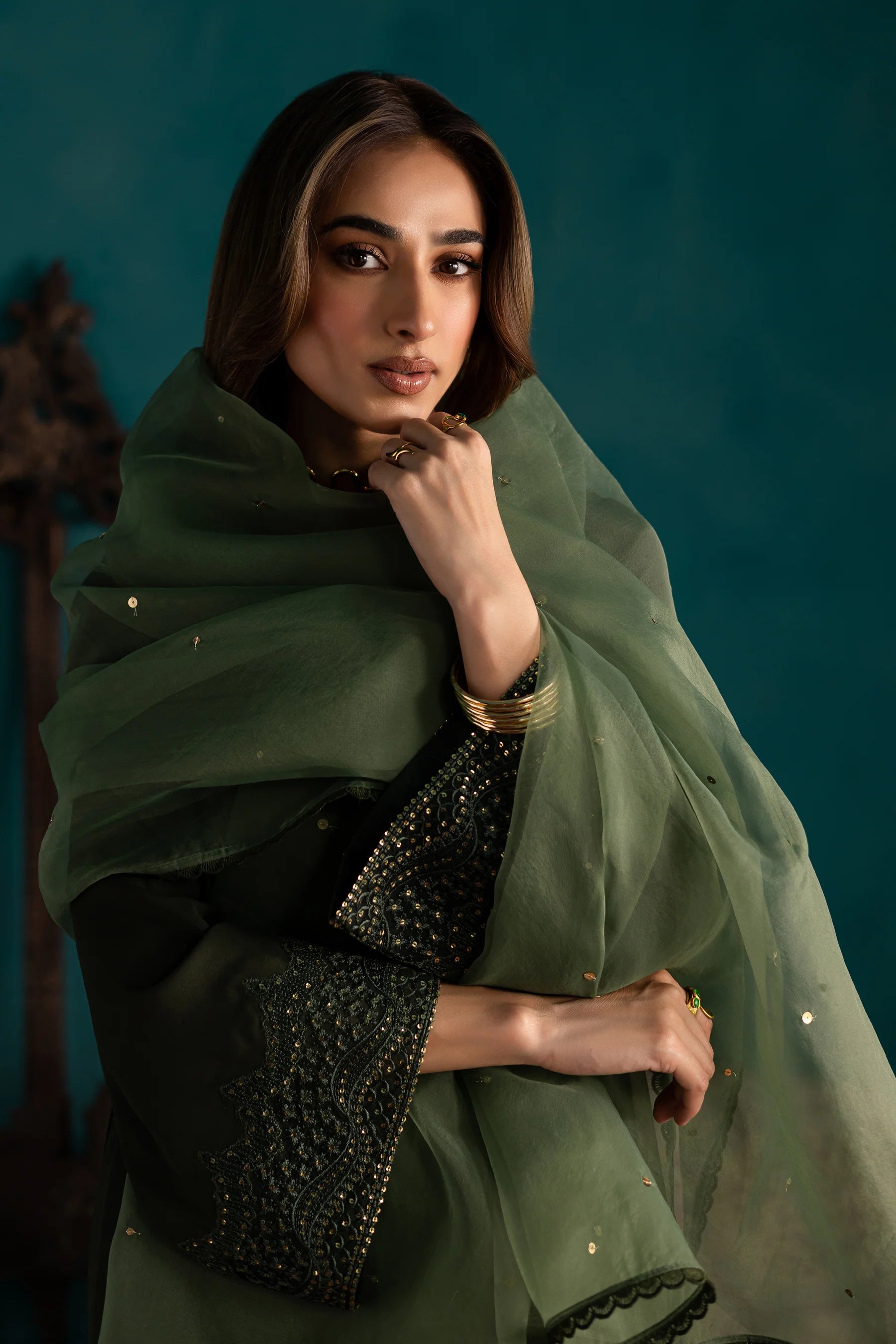 The look is completed with an organza dupatta in soft, lighter tones. It features shirt-colored organza facings along the edges and a delicate sitara spray through the center, adding a gentle touch of sparkle to the overall design.