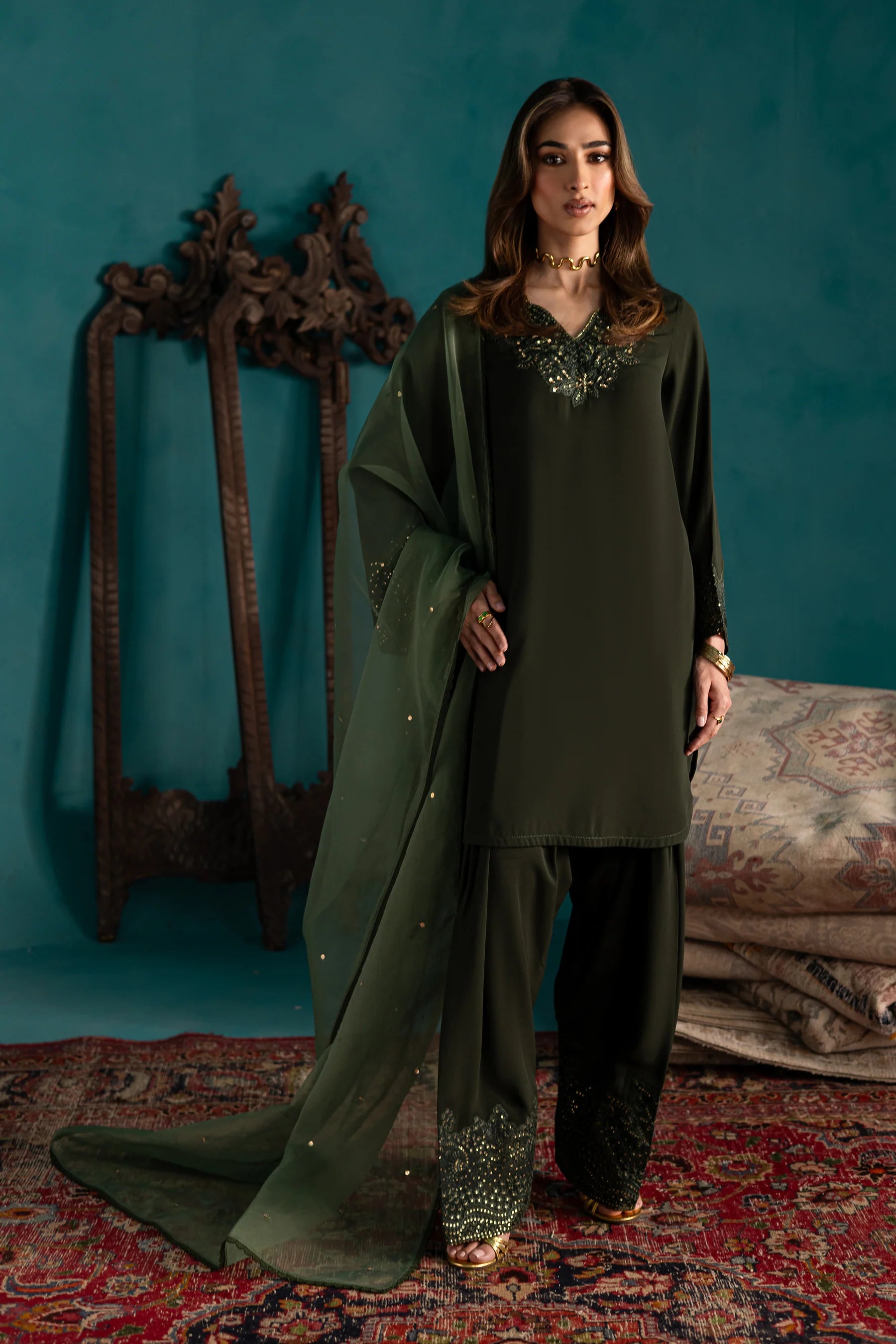 Styled with a loose-fit georgette shalwar, detailed with an embroidered border at the hem that brings comfort and grace together in a relaxed silhouette.