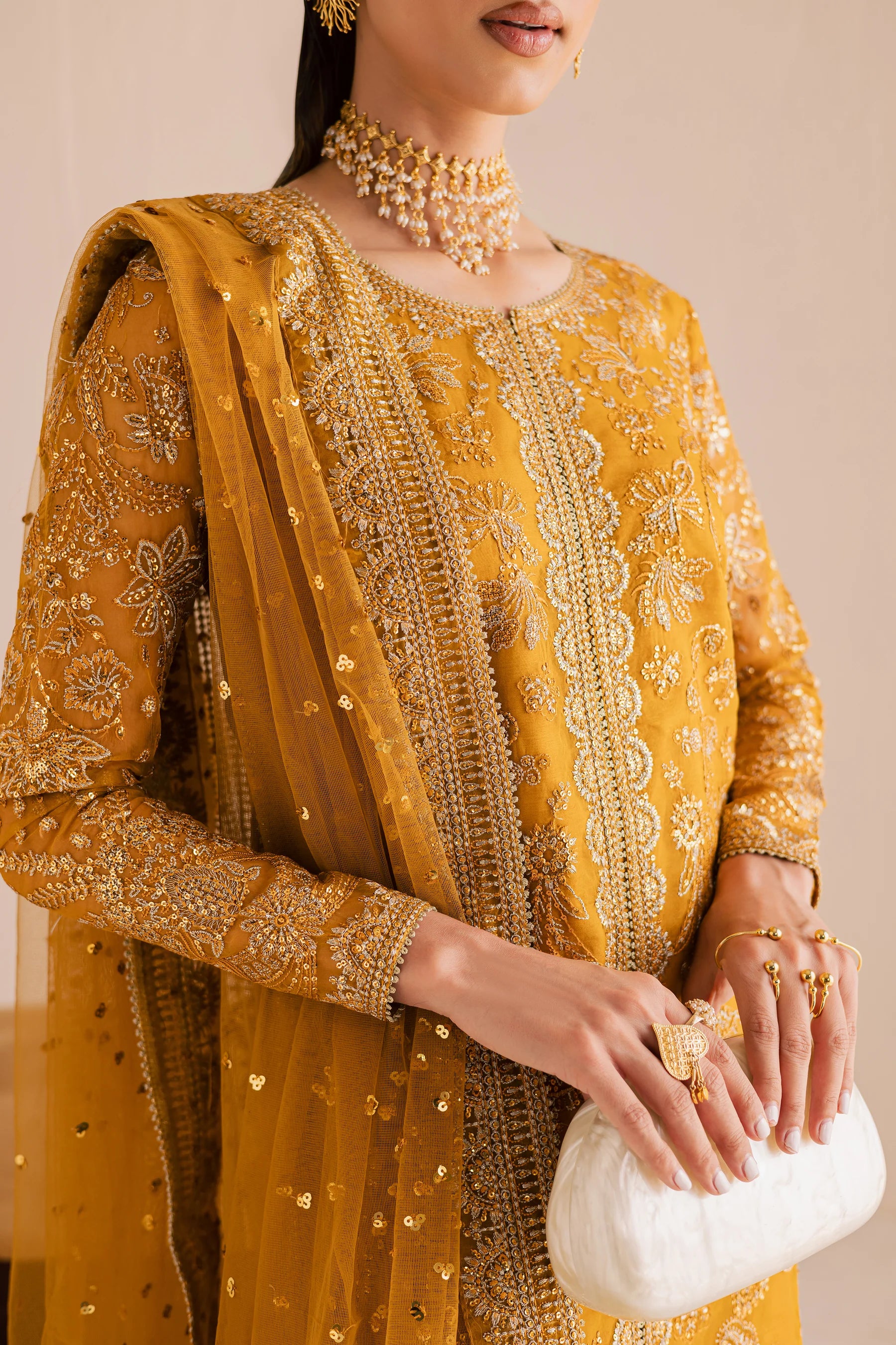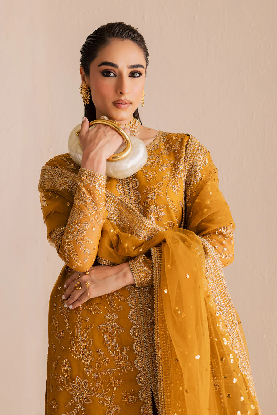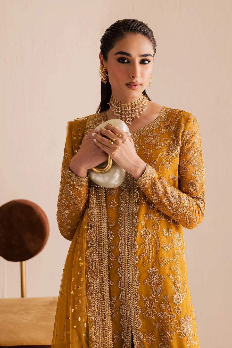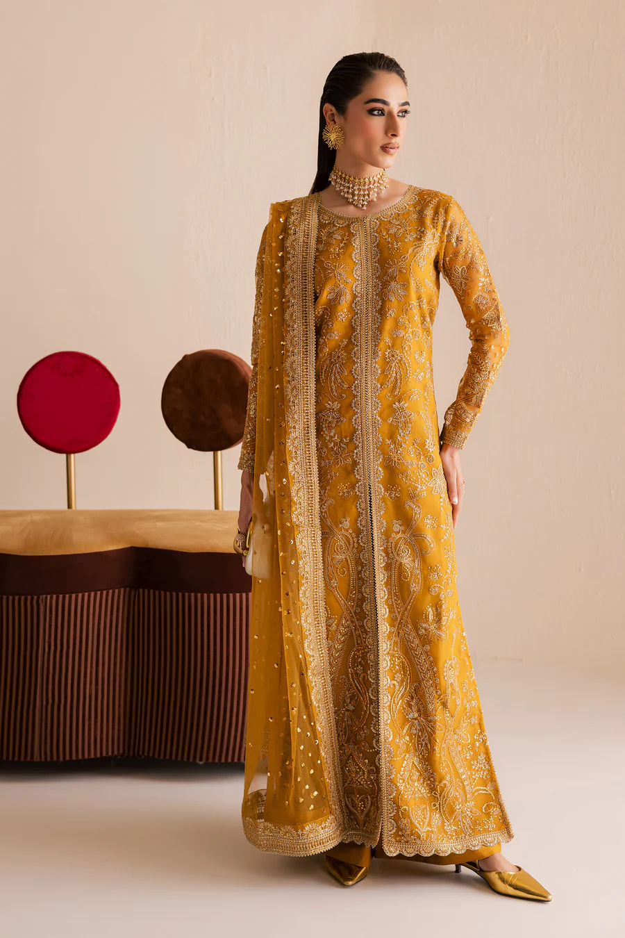 Make a graceful statement with this elegant embroidered mustard organza long front-open shirt, featuring intricate embroidery throughout. The neckline and hem are adorned with delicate embroidered lace, adding a refined finish to this timeless silhouette.