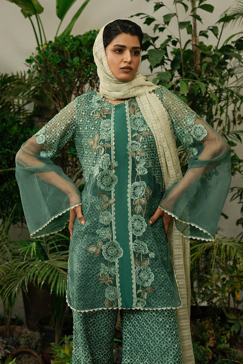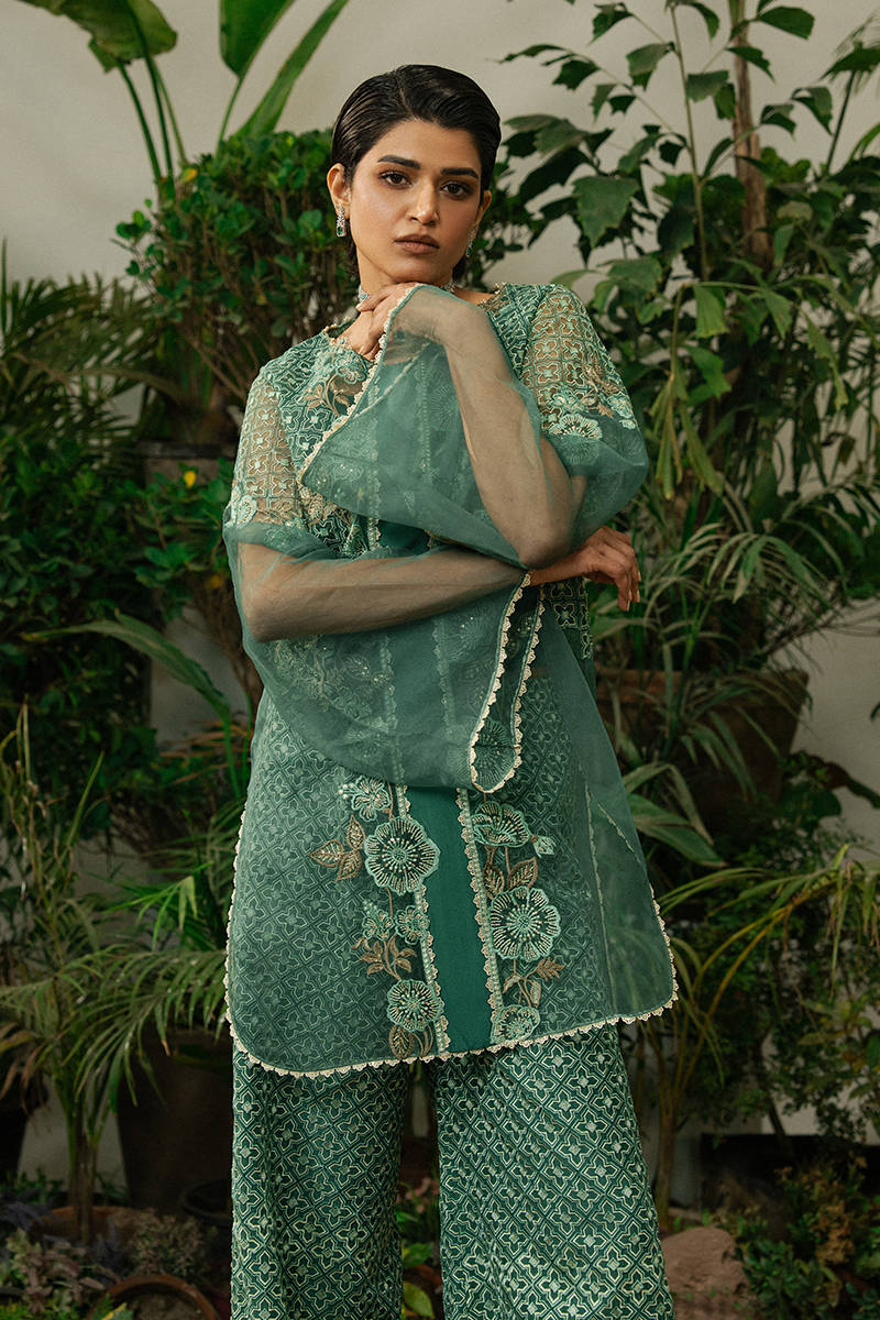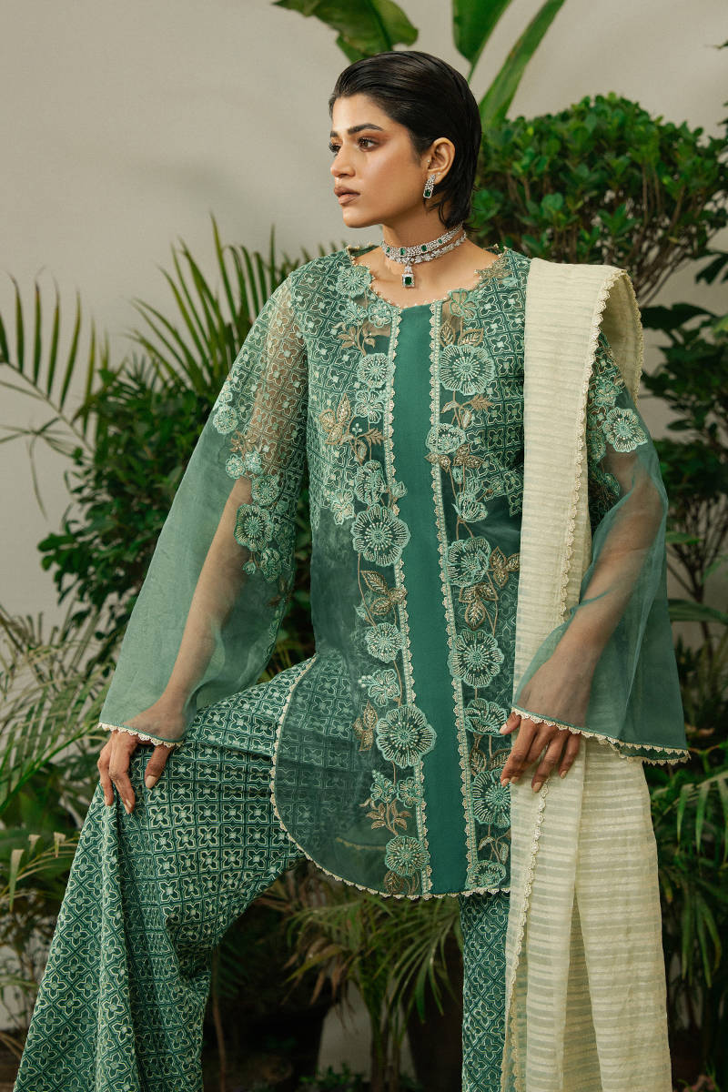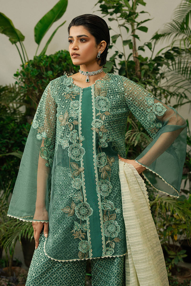 PRODUCT DETAILS SKU: FG-610 Design Code: FG-610 A sage green embroidered organza shirt with a faux-jacket effect, detailed with...