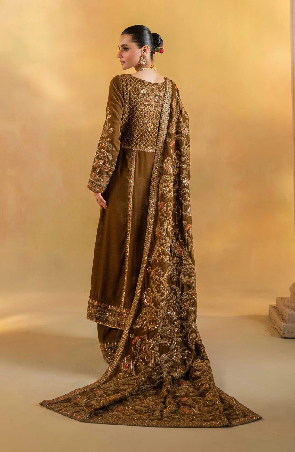 Embrace the warmth of sophistication with this exquisite brown 3-piece velvet suit.. The elegantly dyed front and back panels, paired with intricately embroidered details and patti, create a stunning visual appeal, while the luxurious embroidered dupatta and tailored trousers complete the look. Perfect for formal events, this ensemble captures a perfect blend of contemporary style and classic elegance!