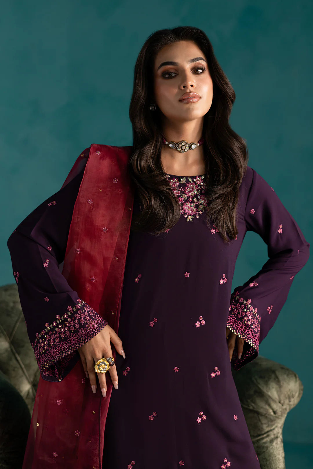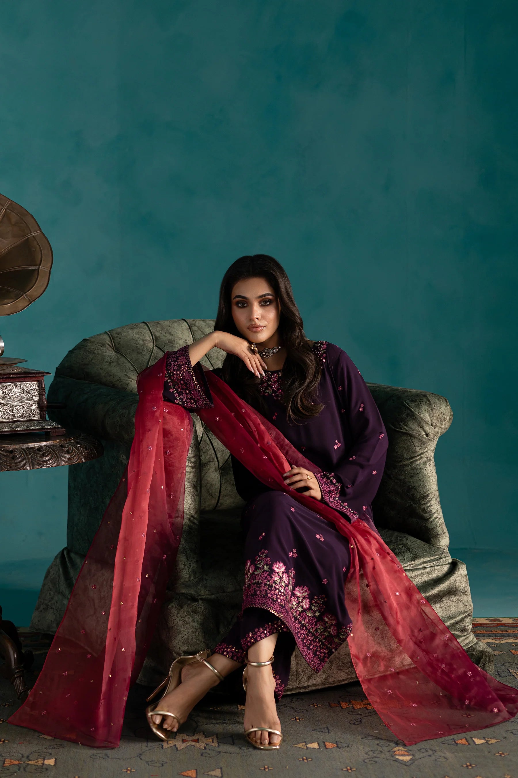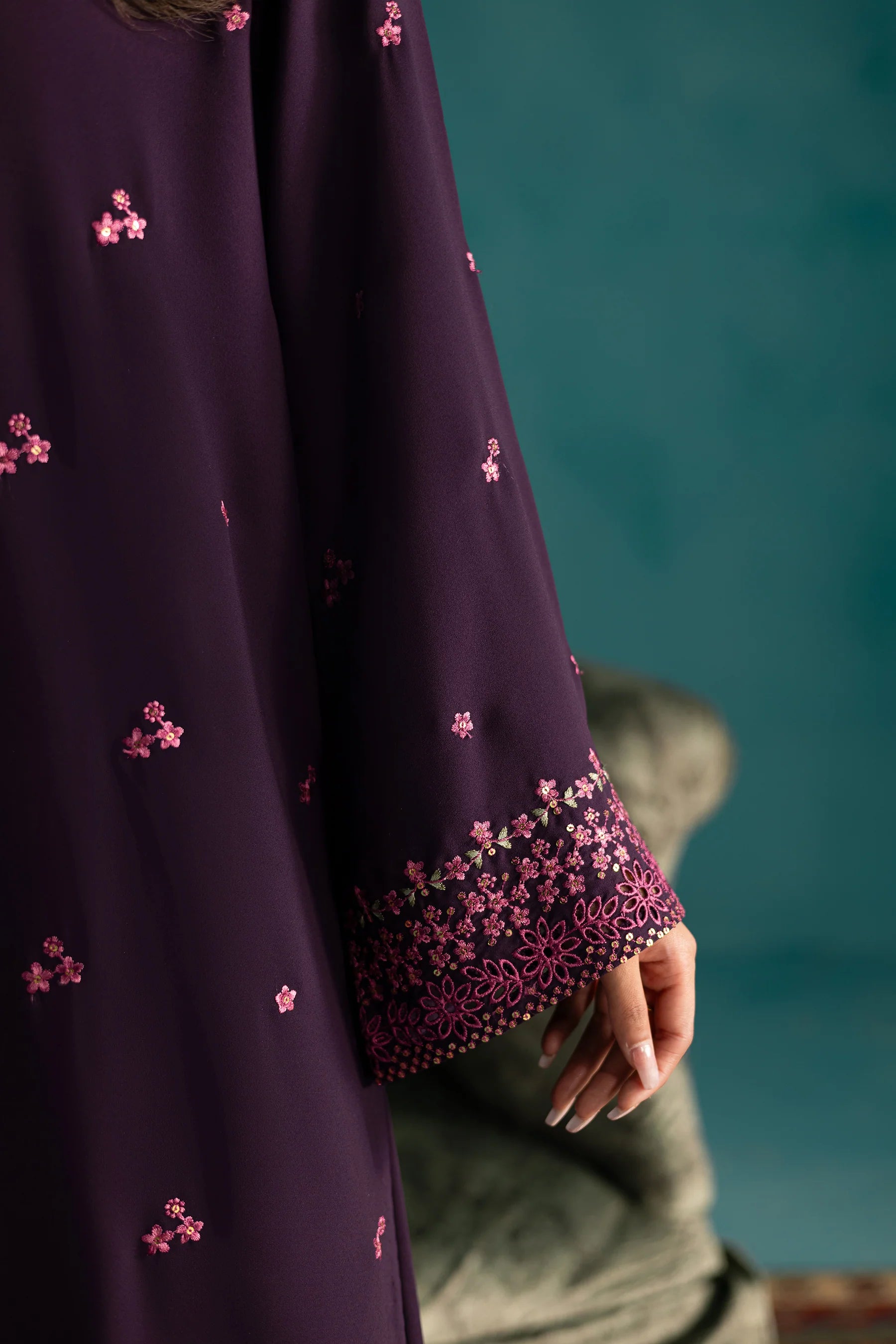 A long plum color georgette shirt featuring an embroidered neckline with subtle adda work, adding a touch of intricate craftsmanship. The shirt is beautifully detailed with an embroidered floral hem and all-over spread embroidery, creating a rich, textured look. The sleeves are finished with an embroidered border at the hem, enhancing the overall design with a refined touch.