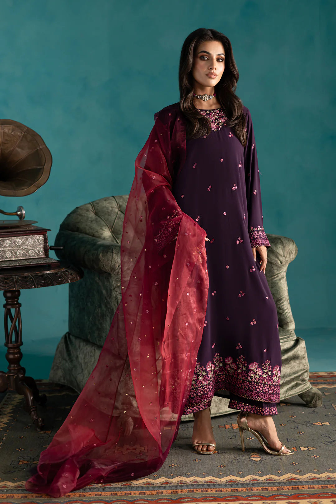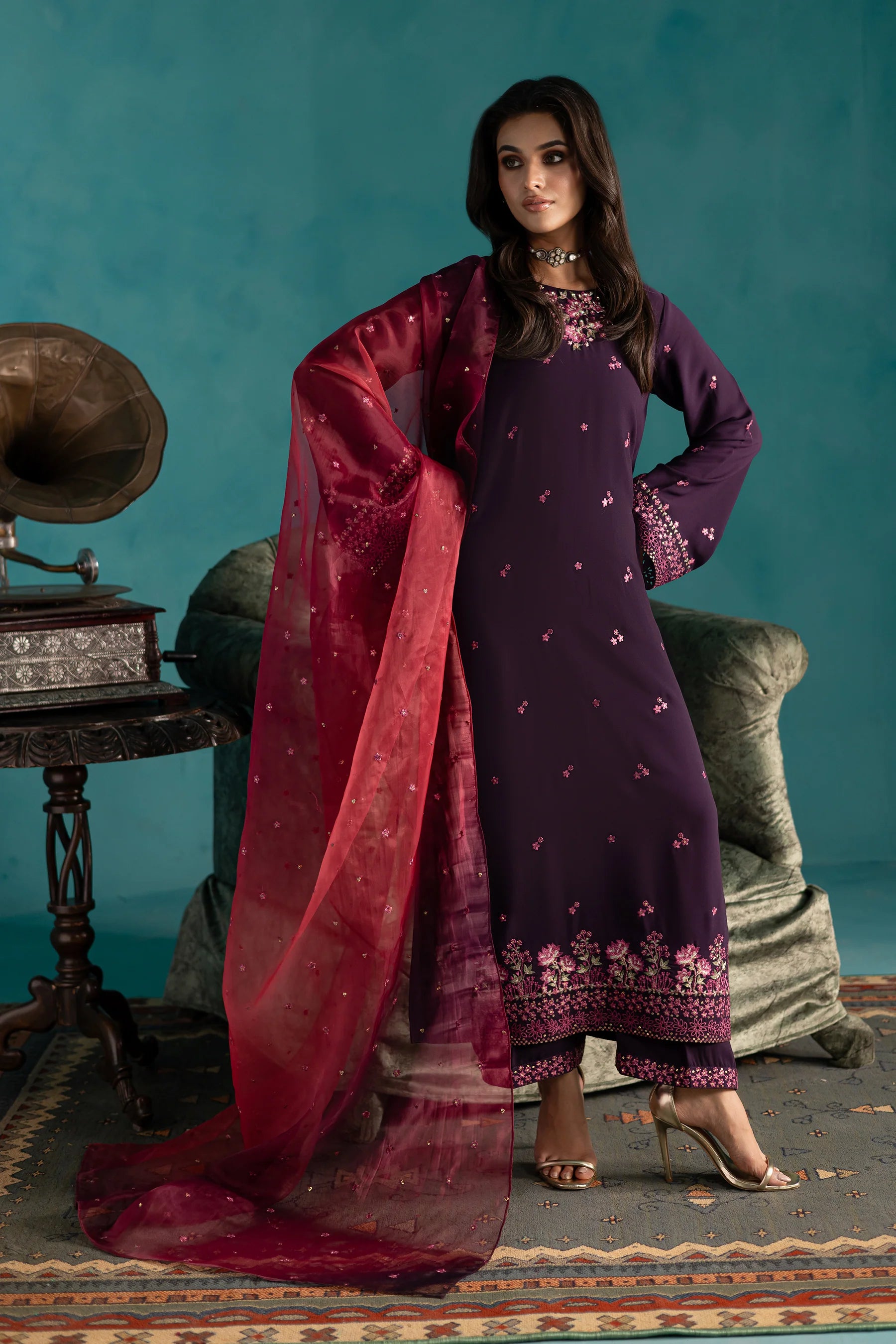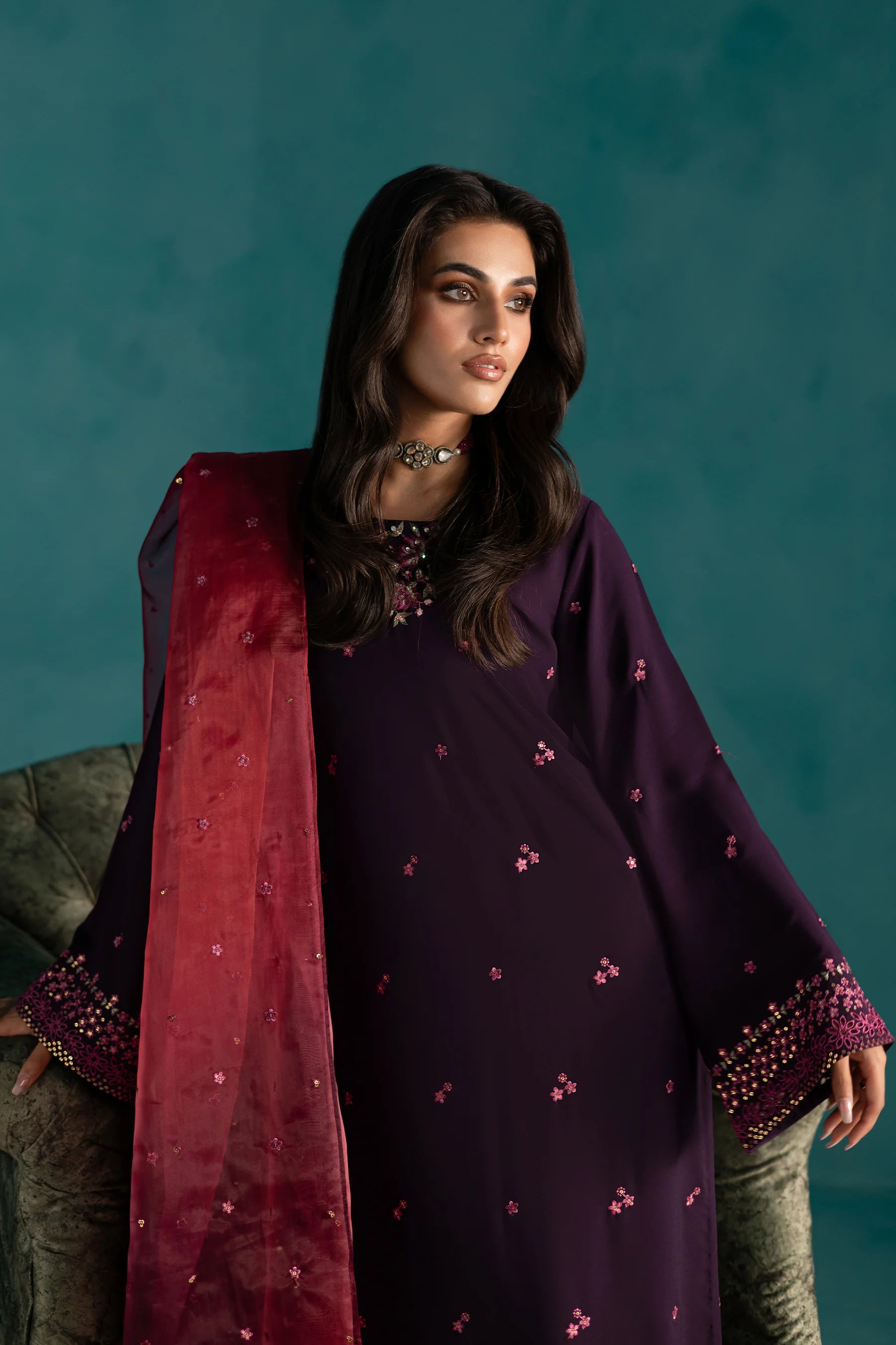 A long plum color georgette shirt featuring an embroidered neckline with subtle adda work, adding a touch of intricate craftsmanship. The shirt is beautifully detailed with an embroidered floral hem and all-over spread embroidery, creating a rich, textured look. The sleeves are finished with an embroidered border at the hem, enhancing the overall design with a refined touch.