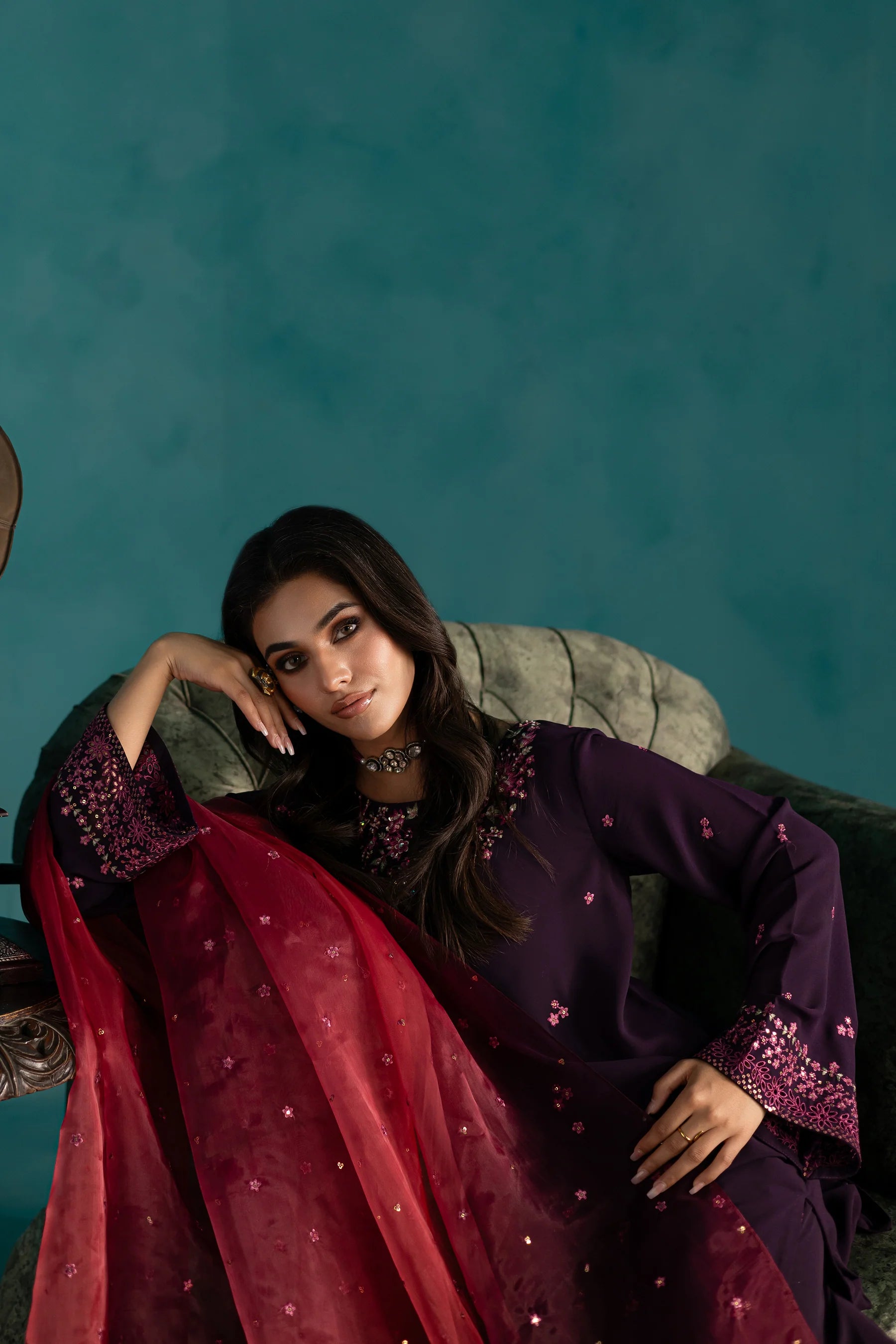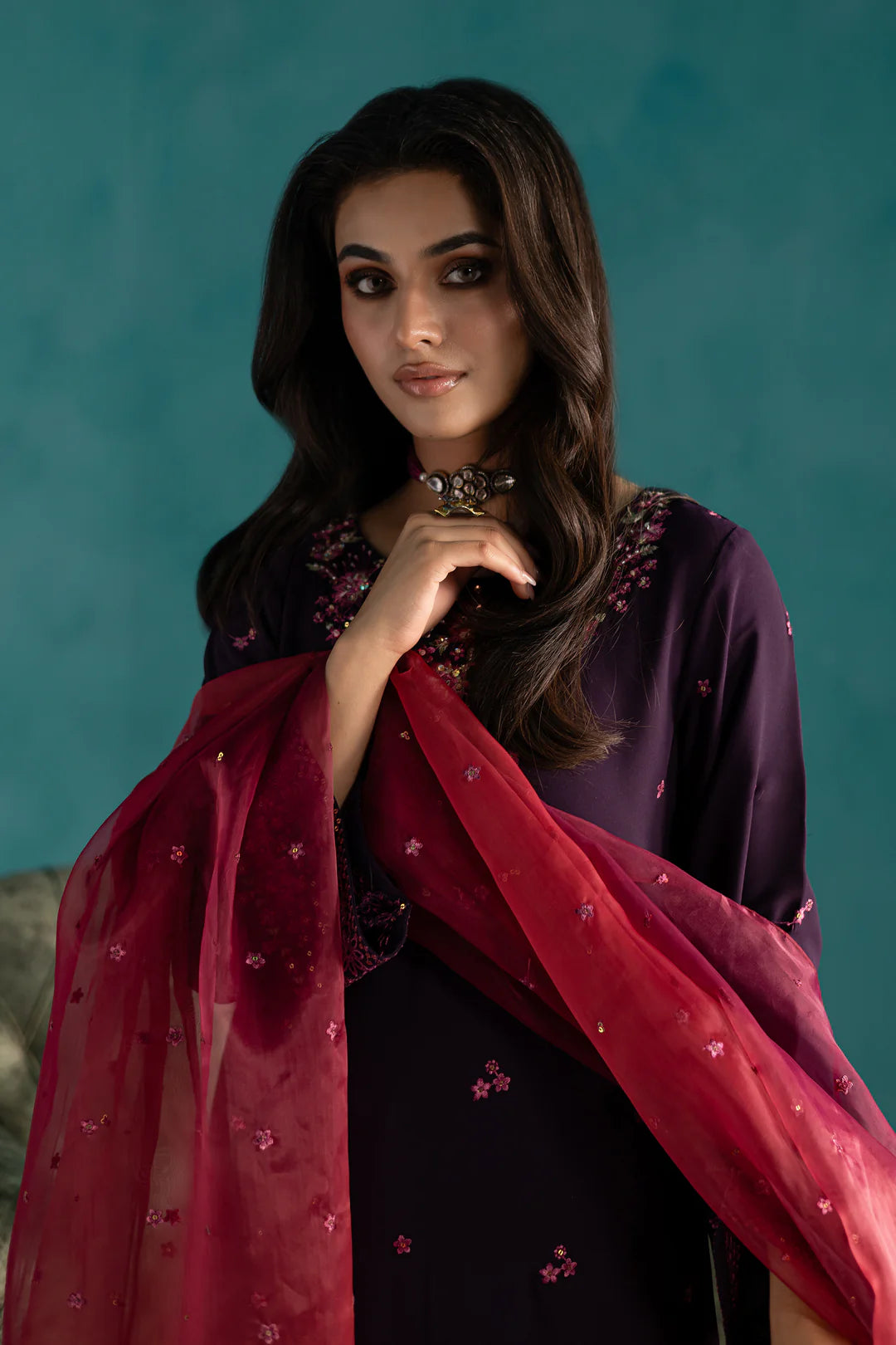 The ensemble is completed with a digitally printed contrast organza dupatta, adorned with all-over spread embroidery for a vibrant, artistic appeal. The dupatta is finished with a clean self-fold edge, adding a polished and sophisticated finish to the look.
