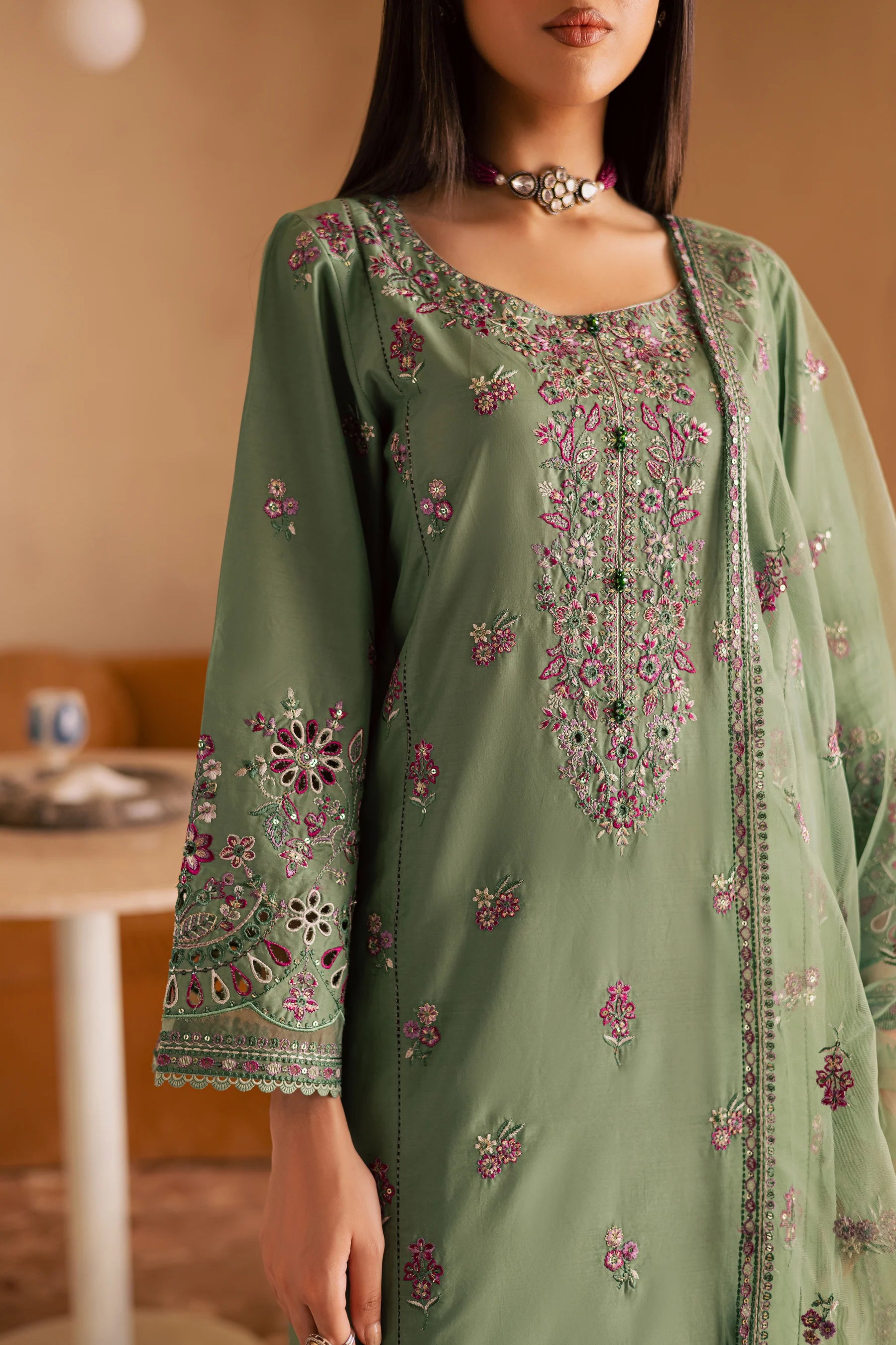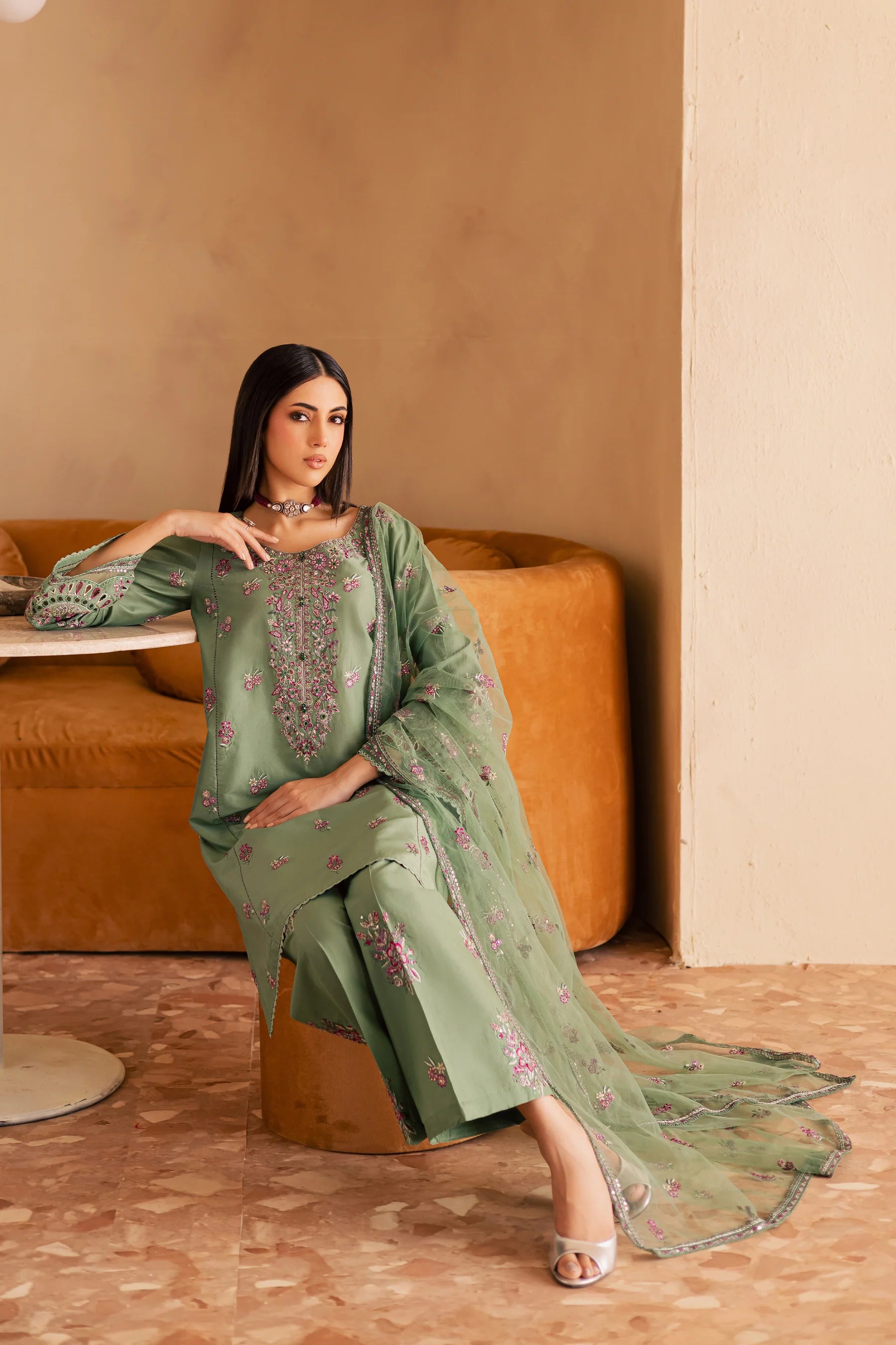 An embroidered net dupatta completes the ensemble, bringing a light, graceful finish with its fine detailing.