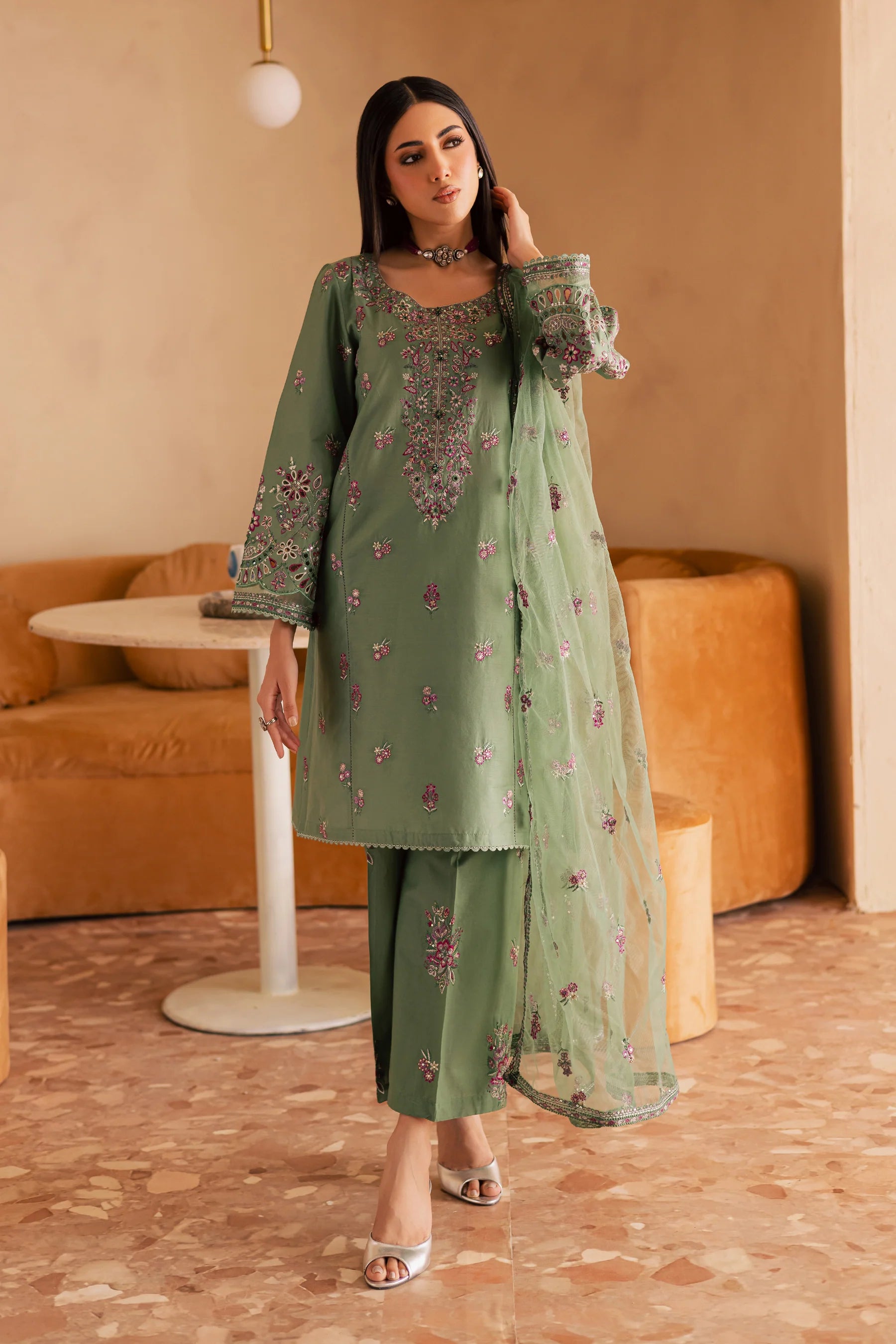 This short paneled dark ivy pima lawn shirt features a beautifully embroidered neckline and a delicate embroidery spread across the front, creating a soft yet elegant look. The scalloped sleeves are finished with intricate embroidery and charming bowring details, adding a playful and refined touch.