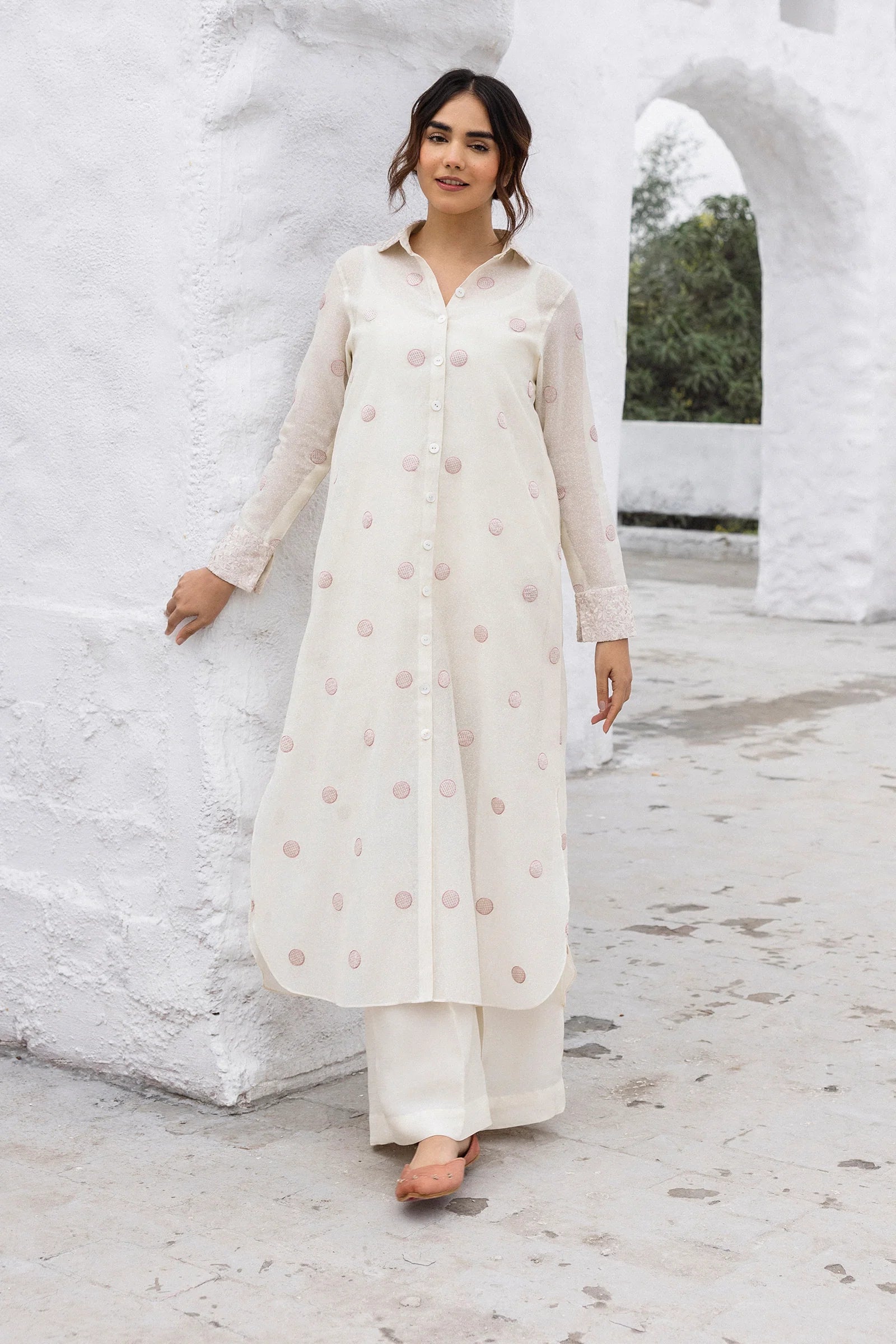 This elegant outfit is crafted from soft cotton karandi in a pristine pearl white hue. The front-open, loose-fit shirt features delicate button details and is beautifully embroidered with silk thread in blush nude, highlighting the cuffs and collar. The shirt is further adorned with charming embroidered polka dots all over, adding a playful touch to the design. It is paired with Korean silk trousers for a sleek and comfortable finish. Completing the look is a stunning organza dupatta with a unique dip-dye effect, adding a soft, gradient touch to this sophisticated ensemble.