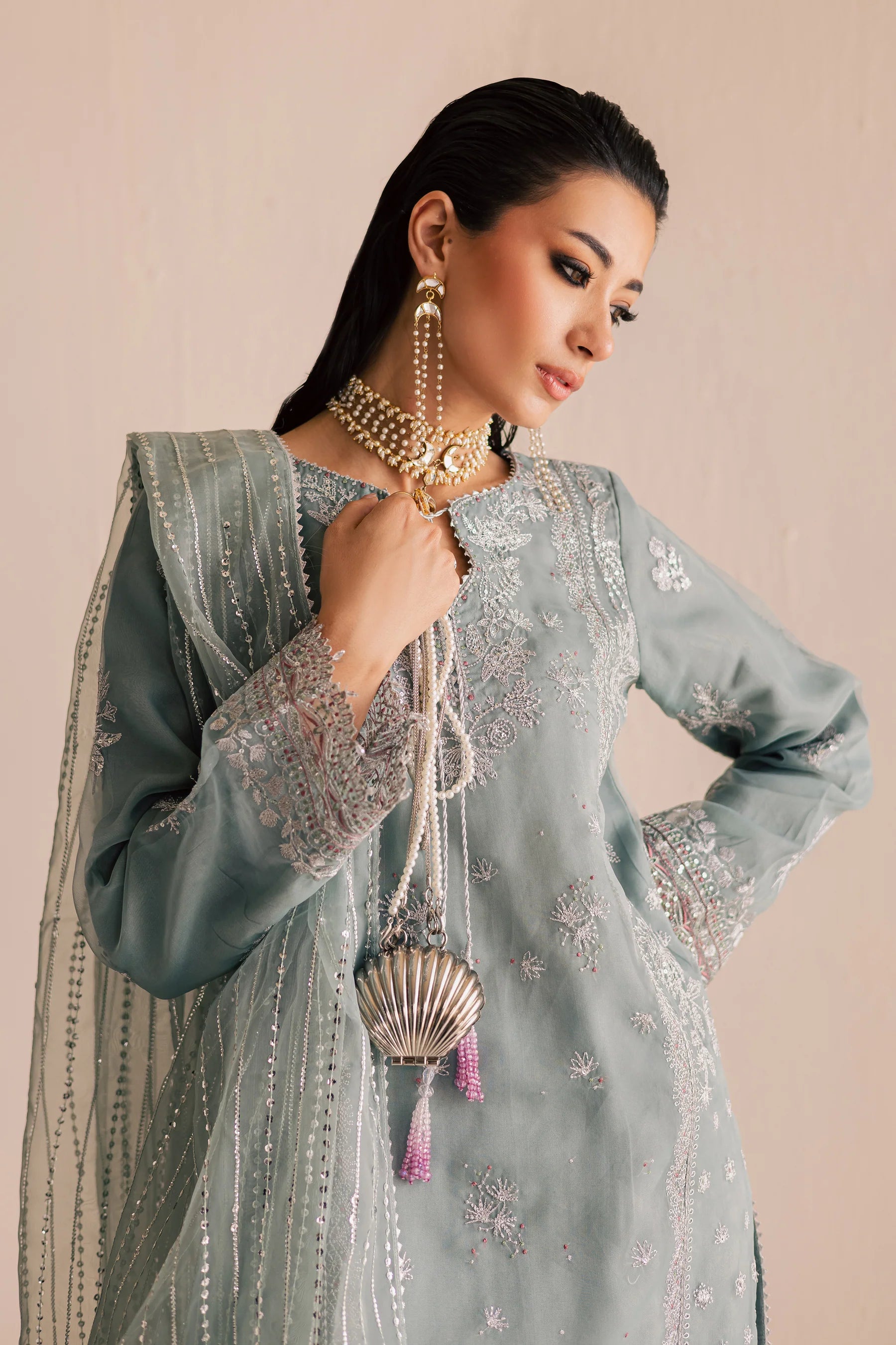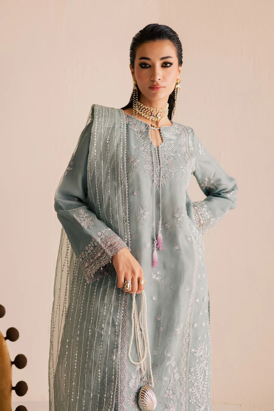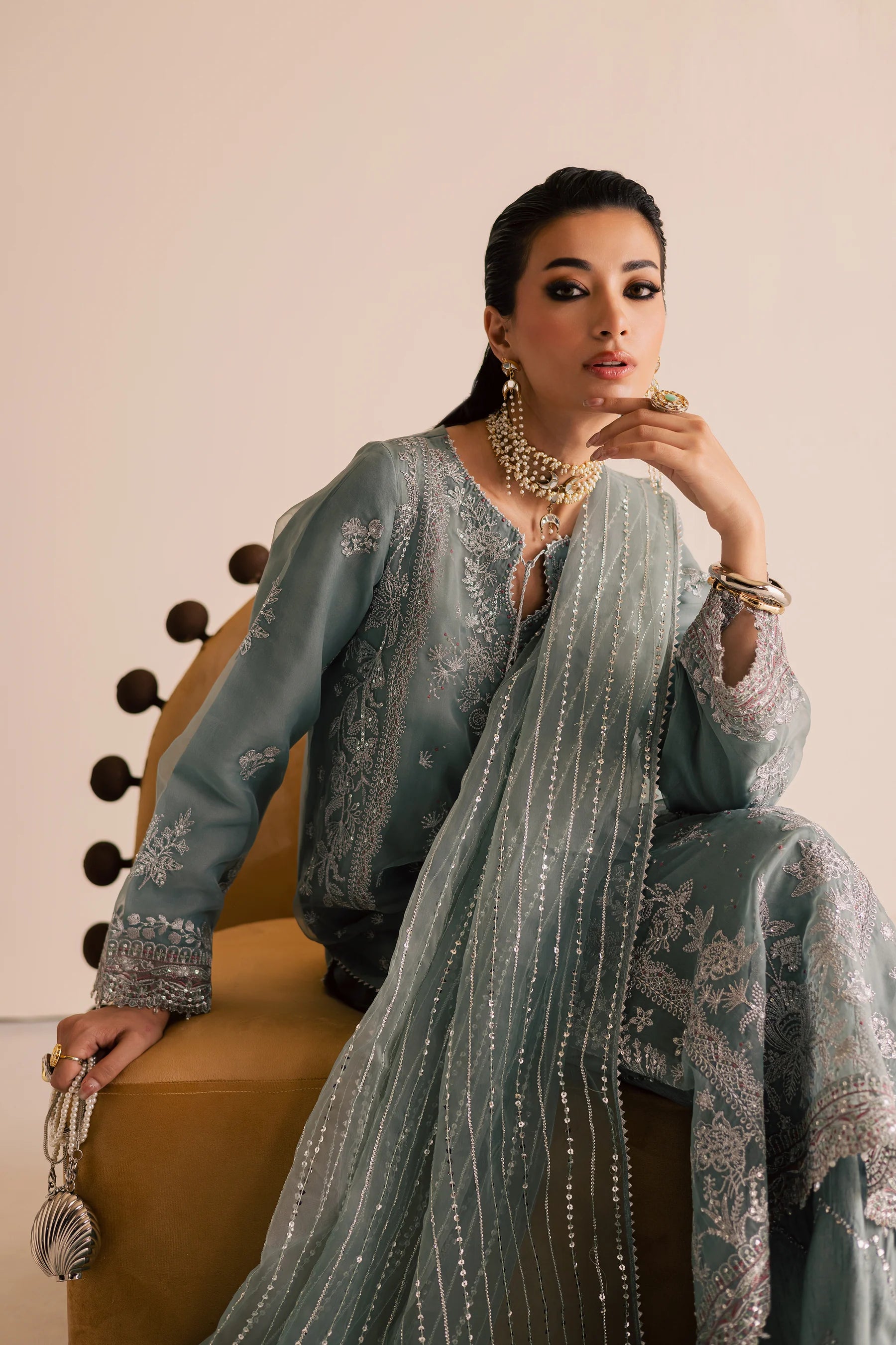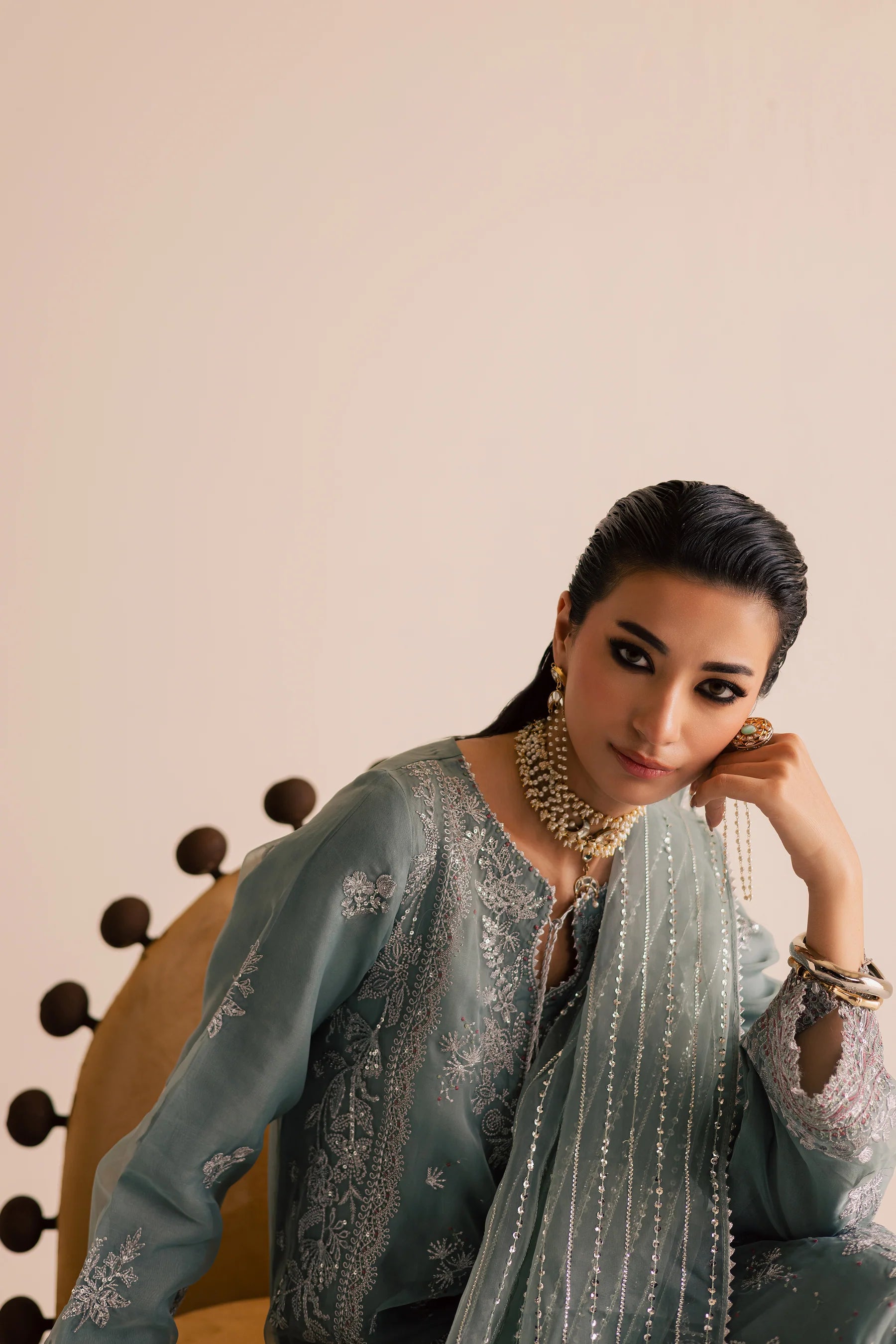 This embroidered ash blue organza paneled shirt is a stunning piece, adorned with crystal tassels and crystal detailing that add a touch of glamour. Intricate embroidery cascades down the hem, complemented by embroidered borders on the hem and sleeves, with crystal detailing enhancing the delicate finish.