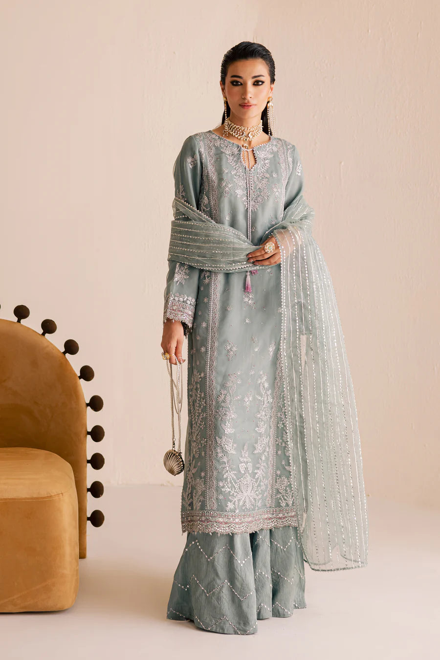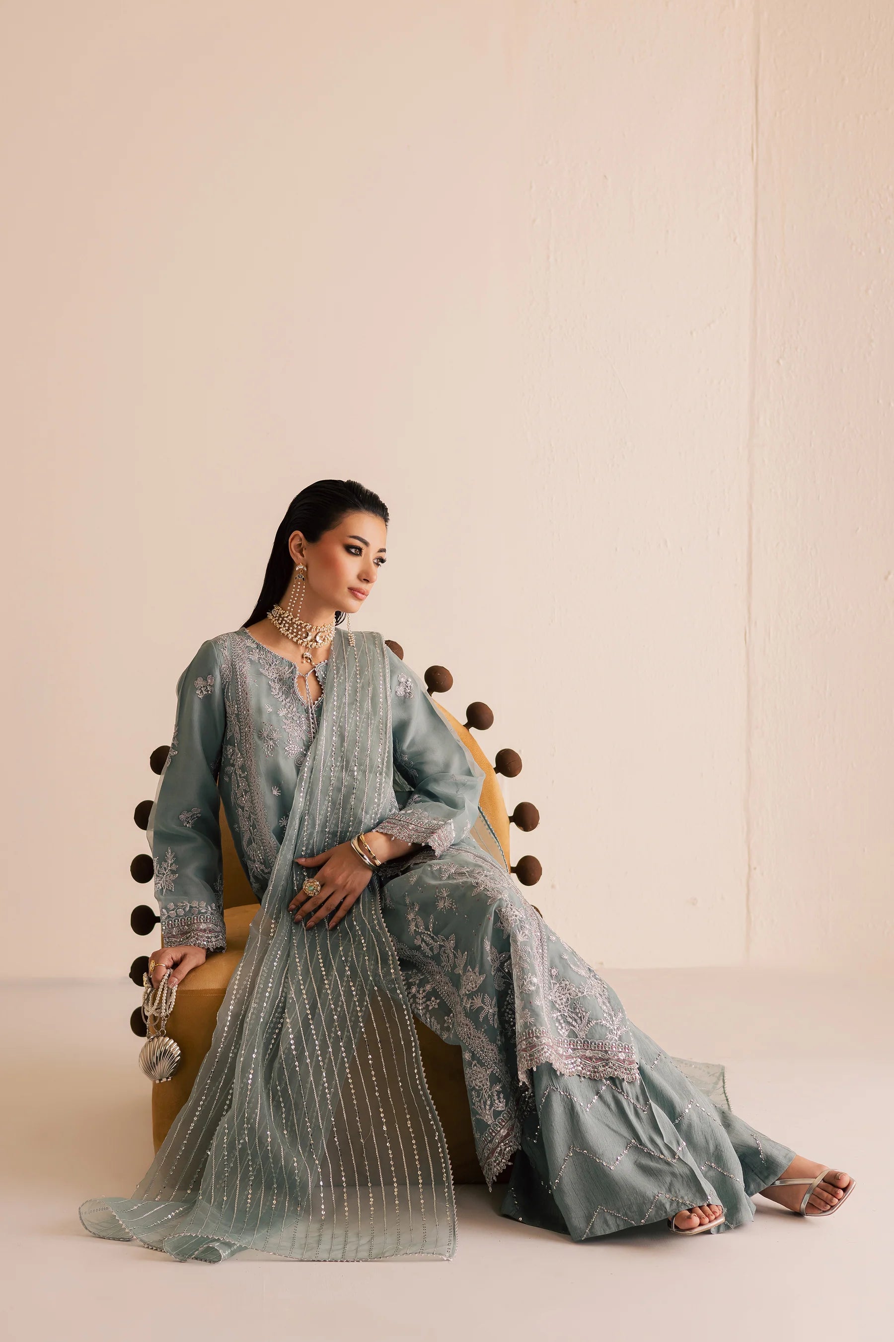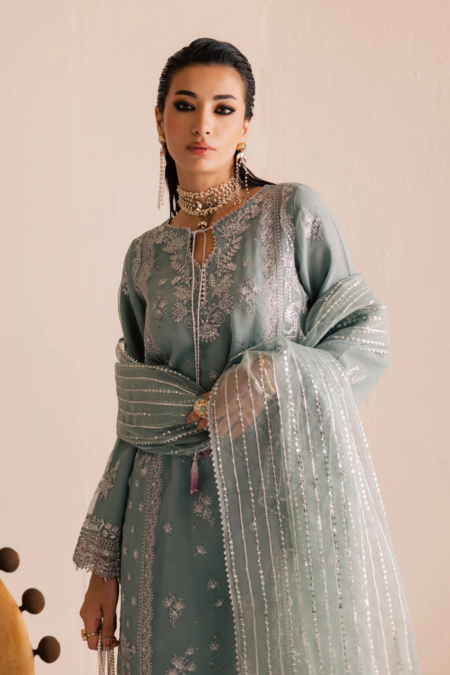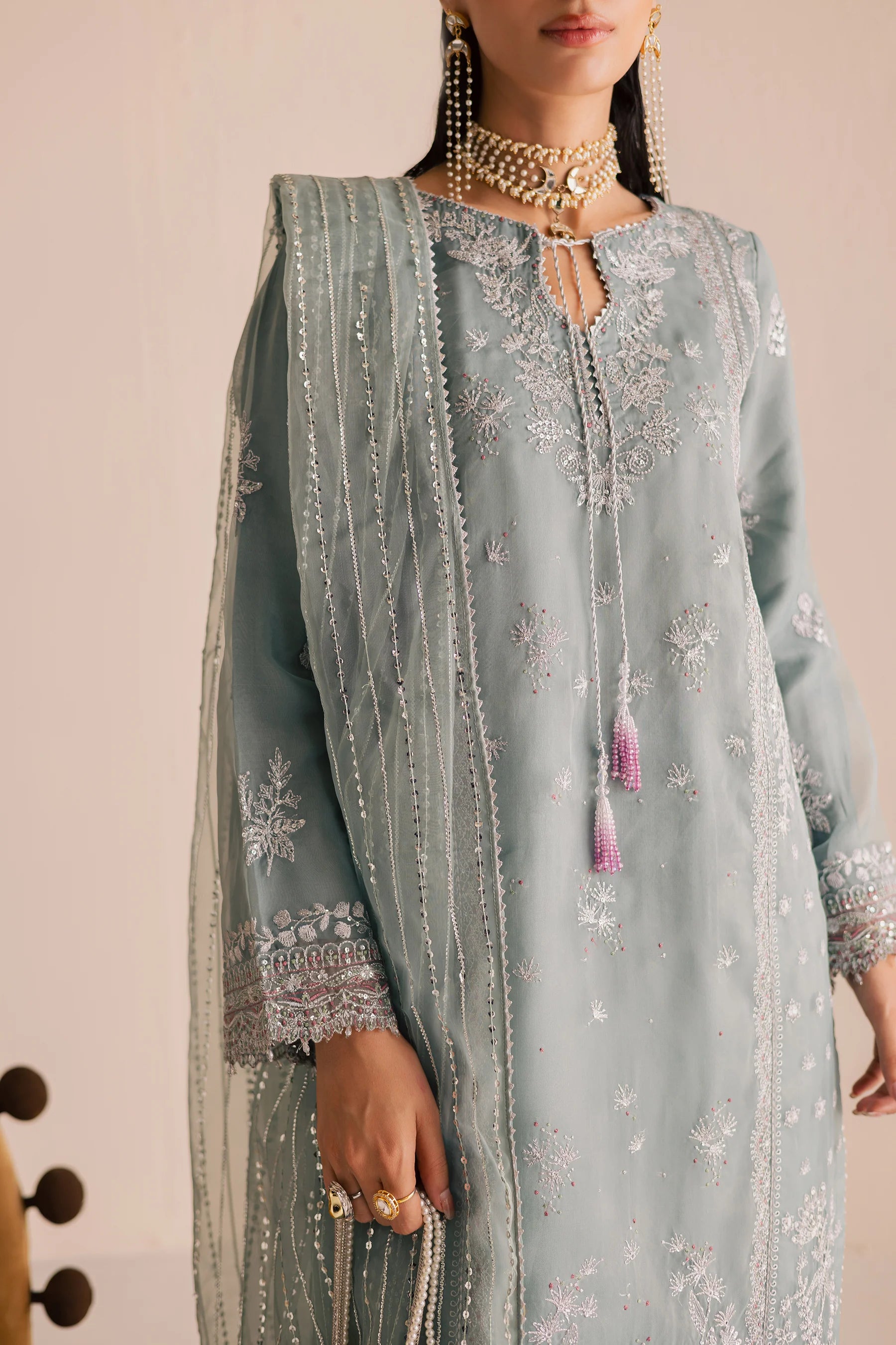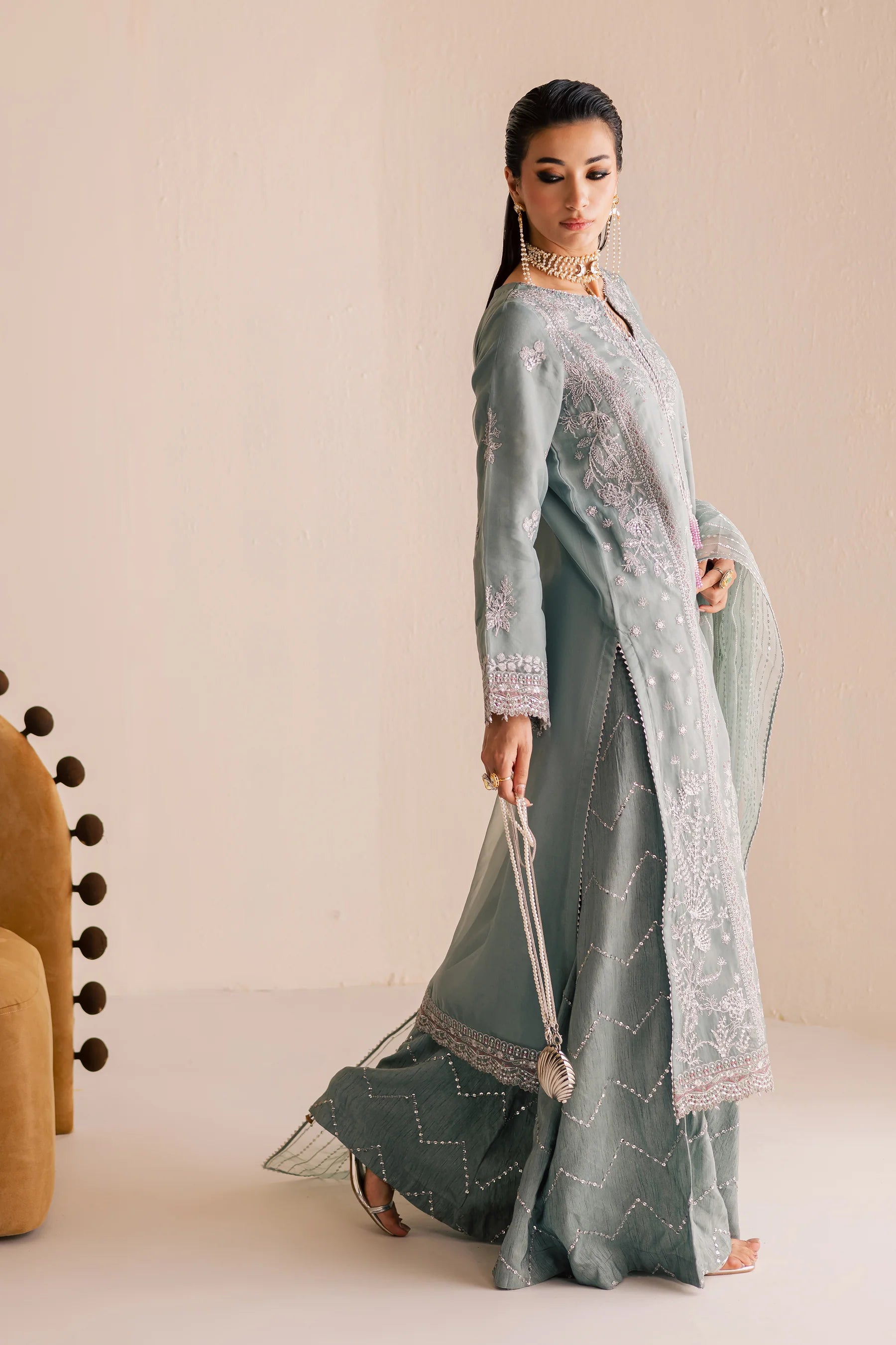 This embroidered ash blue organza paneled shirt is a stunning piece, adorned with crystal tassels and crystal detailing that add a touch of glamour. Intricate embroidery cascades down the hem, complemented by embroidered borders on the hem and sleeves, with crystal detailing enhancing the delicate finish.