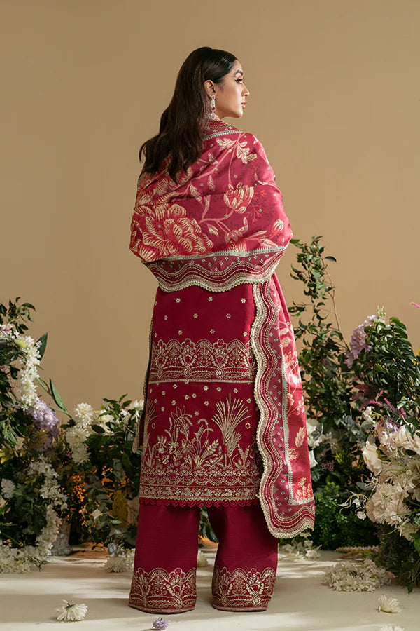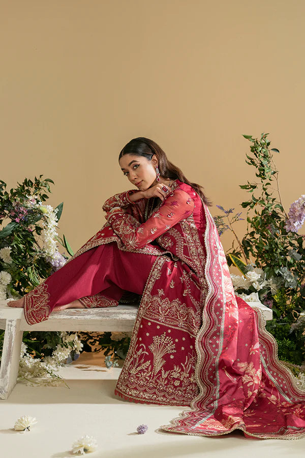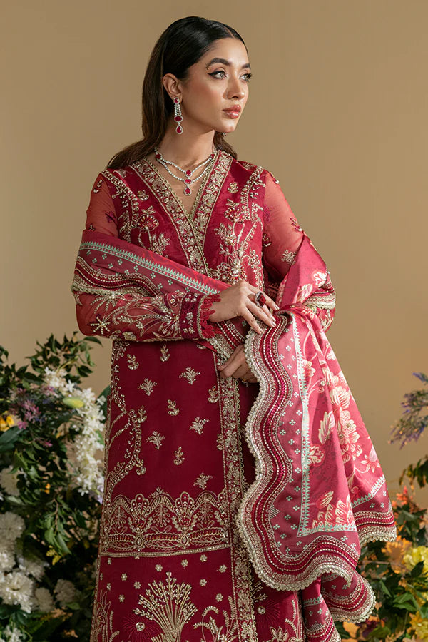 Zara's bridal allure captivates with a vibrant blend of red and pink hues. The organza shirt paired with raw silk trousers creates a perfect harmony. Silk dupatta drapes gracefully, adorned with intricate pearls, dabka, kiran, Tilla, and thread work. A radiant ensemble, where artistry intertwines with passion, leaving admirers enchanted with every exquisite detail.